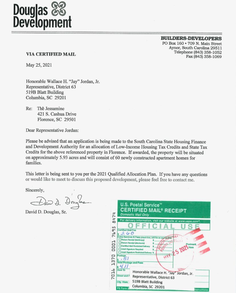 In an interesting wrinkle to this story, the developer of the “Jessamine” is reportedly quite miffed at Jordan and other politicians who have decided to express “concerns” about the project in the eleventh hour of a political campaign. In fact, a source close to the project provided me with a copy of a certified letter delivered to Jordan dated May 25, 2021.