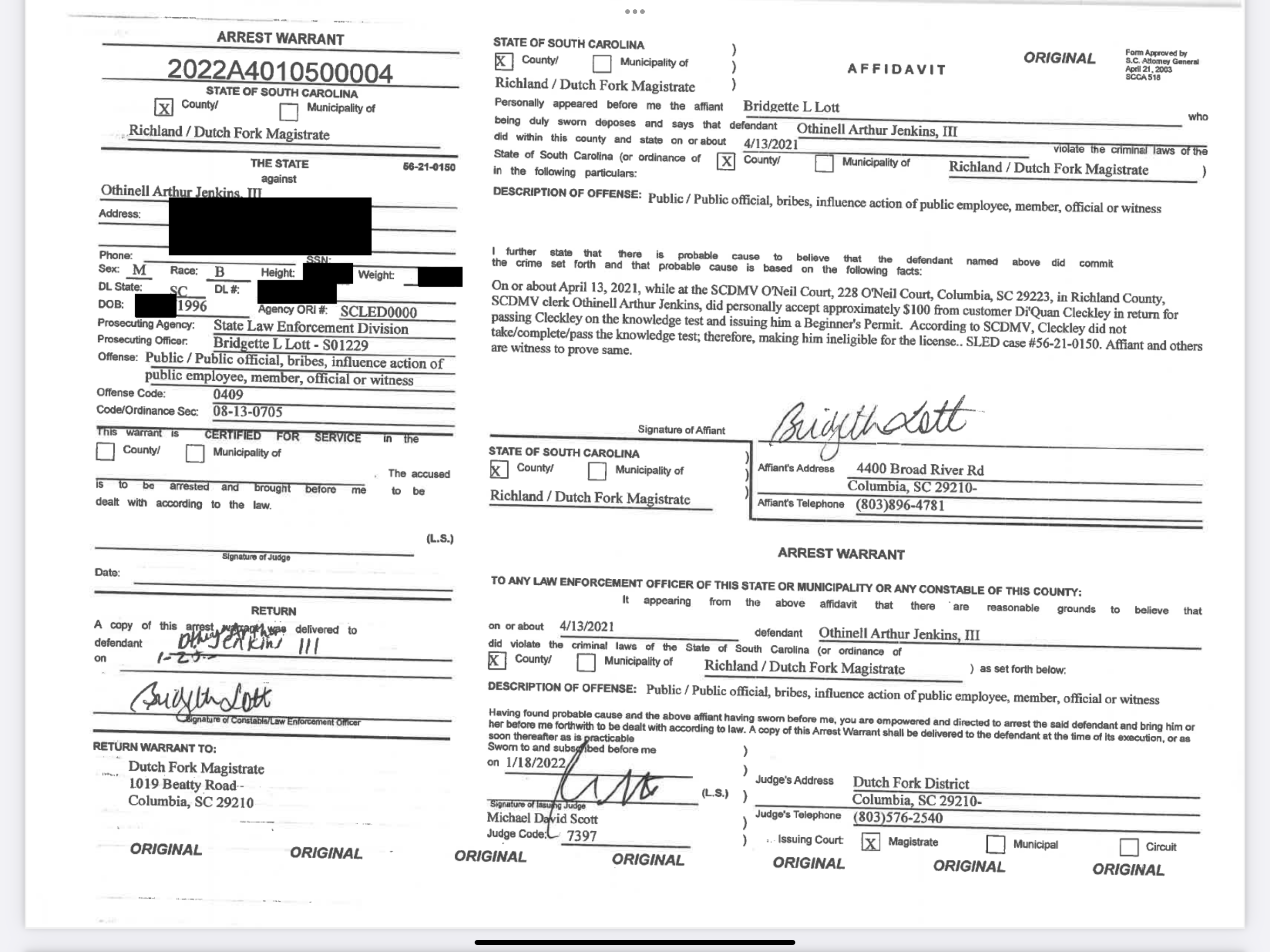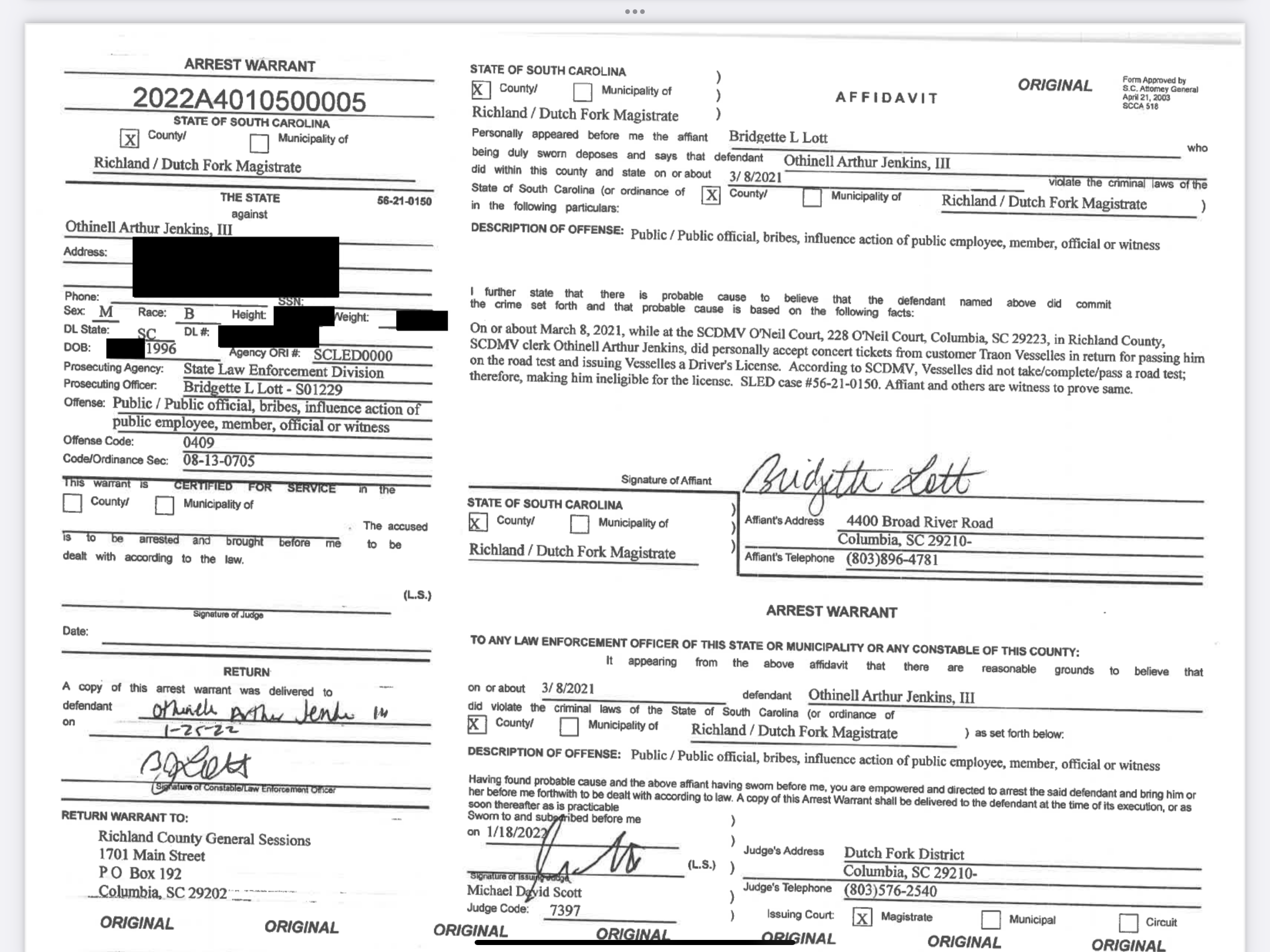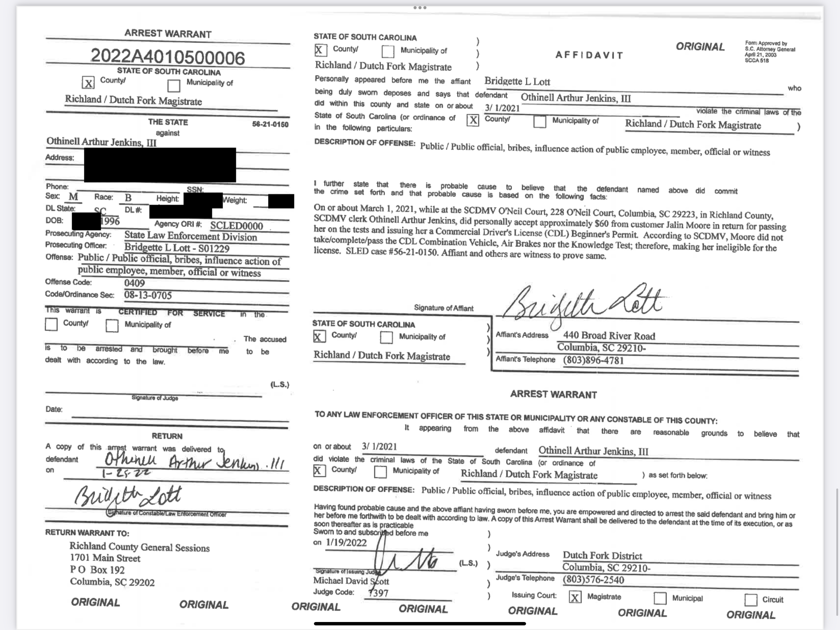 Also in March 2021, Jenkins is accused of taking around $60 from a customer to issue her a Commercial Driver’s License. The customer “did not take/complete/pass the CDL Combination Vehicle, Air Brakes nor the Knowledge Test,” according to Jenkins’ arrest warrants.
