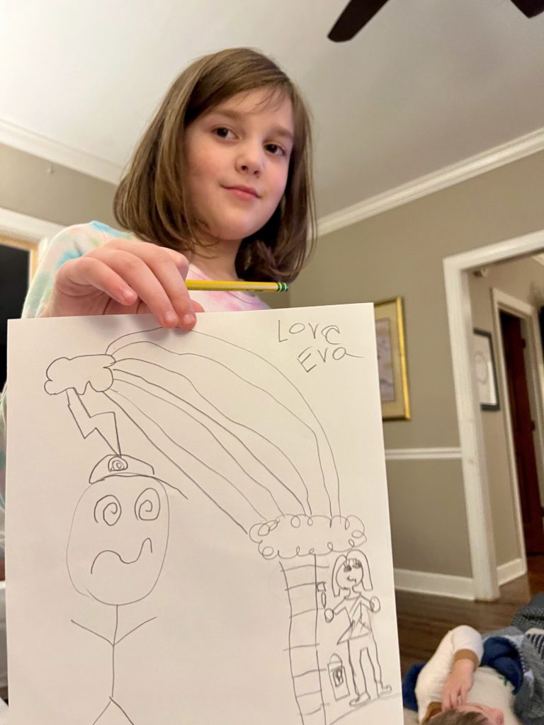 12:40 p.m. EST – So this is my eight-year-old, Eva Margaretta … she drew this last night and apparently I am getting struck in the head by lightning? Lots going on here …