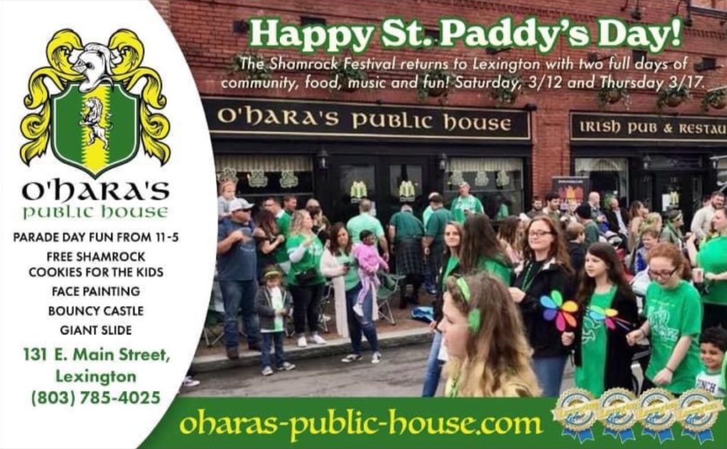 Interested in checking out the pub on one of its most festive days of the year? The traditional Lexington, S.C. Shamrock Parade and Concert will be held Saturday March 12 beginning at 2:00 p.m. EST at the Icehouse Amphitheater. There will be food vendors and drinks to purchase, as well as live music starting at 3:30 p.m. EST. One of the acts scheduled to perform is The Bograts, an Irish duo from Charleston.