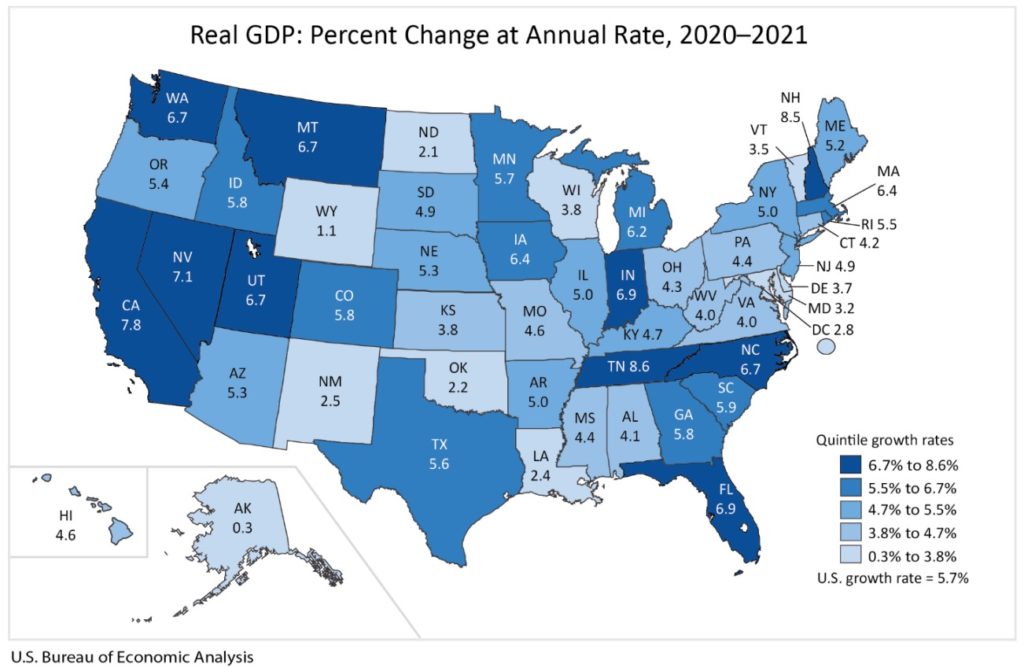 According to data (.pdf) released this week by the U.S. Bureau of Economic Analysis (BEA), the Palmetto State’s economy expanded at a 5.9 percent clip in 2021 – just ahead of the national average of 5.7 percent growth.