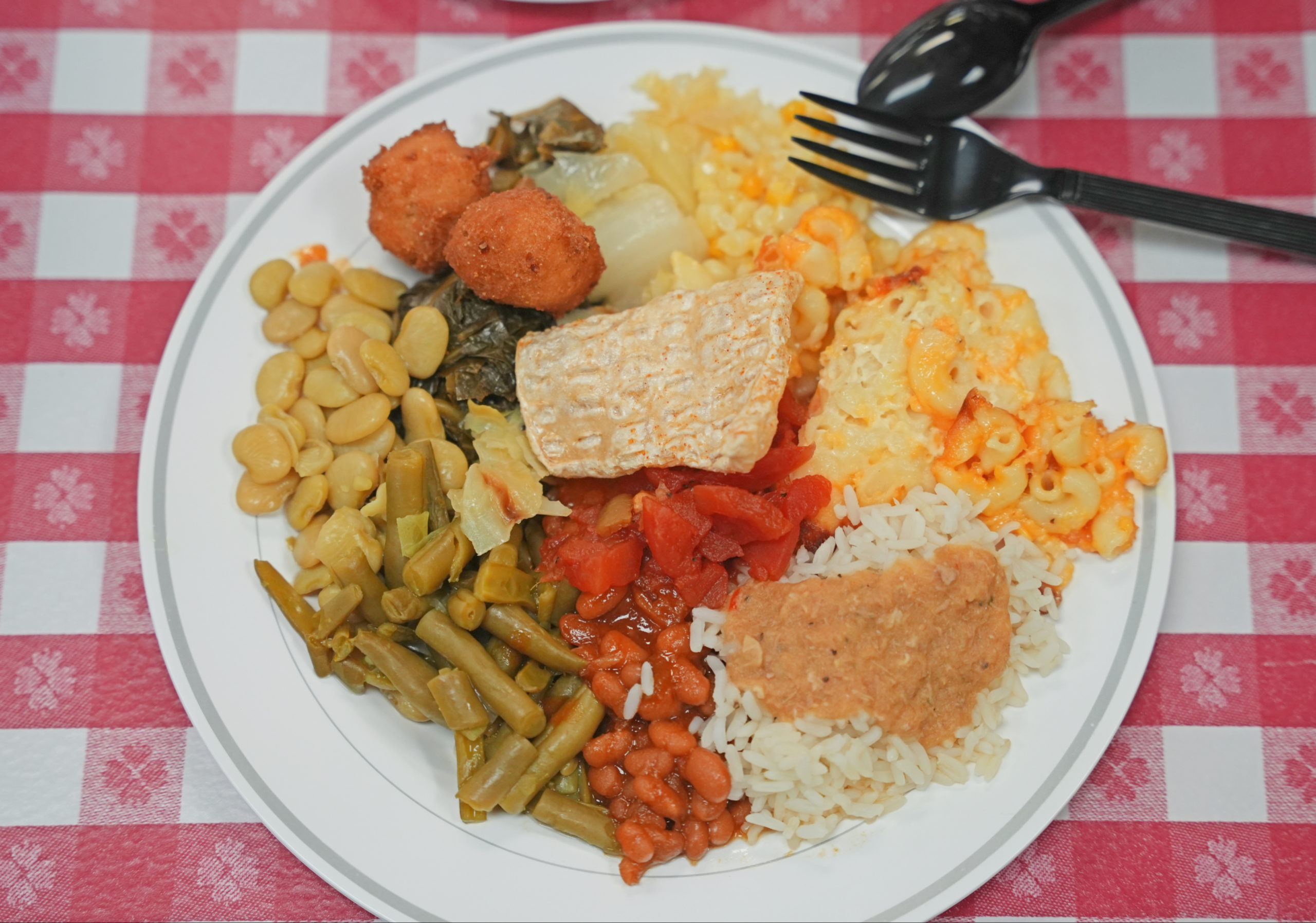 Enticed by the sight of the buffet and the aroma in the restaurant, I grew hungrier as I waited my turn. I don’t mind my food touching, and I like it piled high — I put as many colors, textures and options on my plate that would fit. I made it to a community table, had a seat and prepared to dig in.