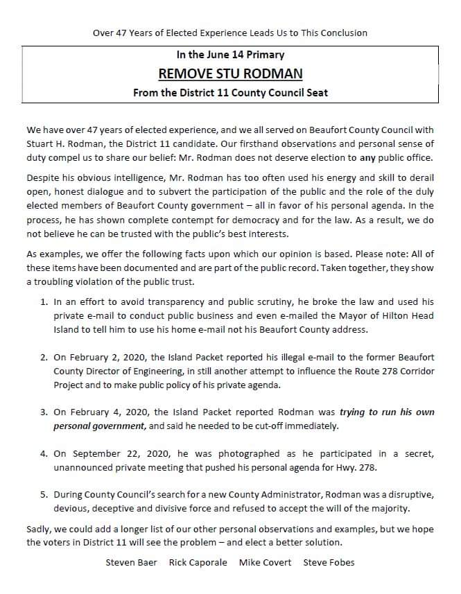 “Despite his obvious intelligence, Mr. Rodman has too often used his energy and skill to derail open, honest dialogue and to subvert the participation of the public and the role off the duly elected members of Beaufort County government — all in favor of his personal agenda. In the process, he has shown contempt for democracy and for the law. As a result, we do not believe he can be trusted with the public’s best interests.”
