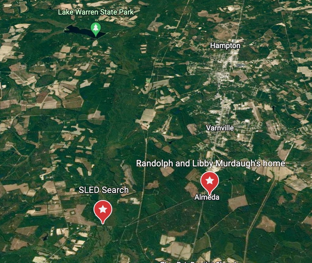 Courtesy of our intrepid researcher Jenn Wood, here is a look at the location of the search in proximity to Varnville – a town of just under 2,000 located in the center of Hampton County, S.C – and Randolph Murdaugh’s home.