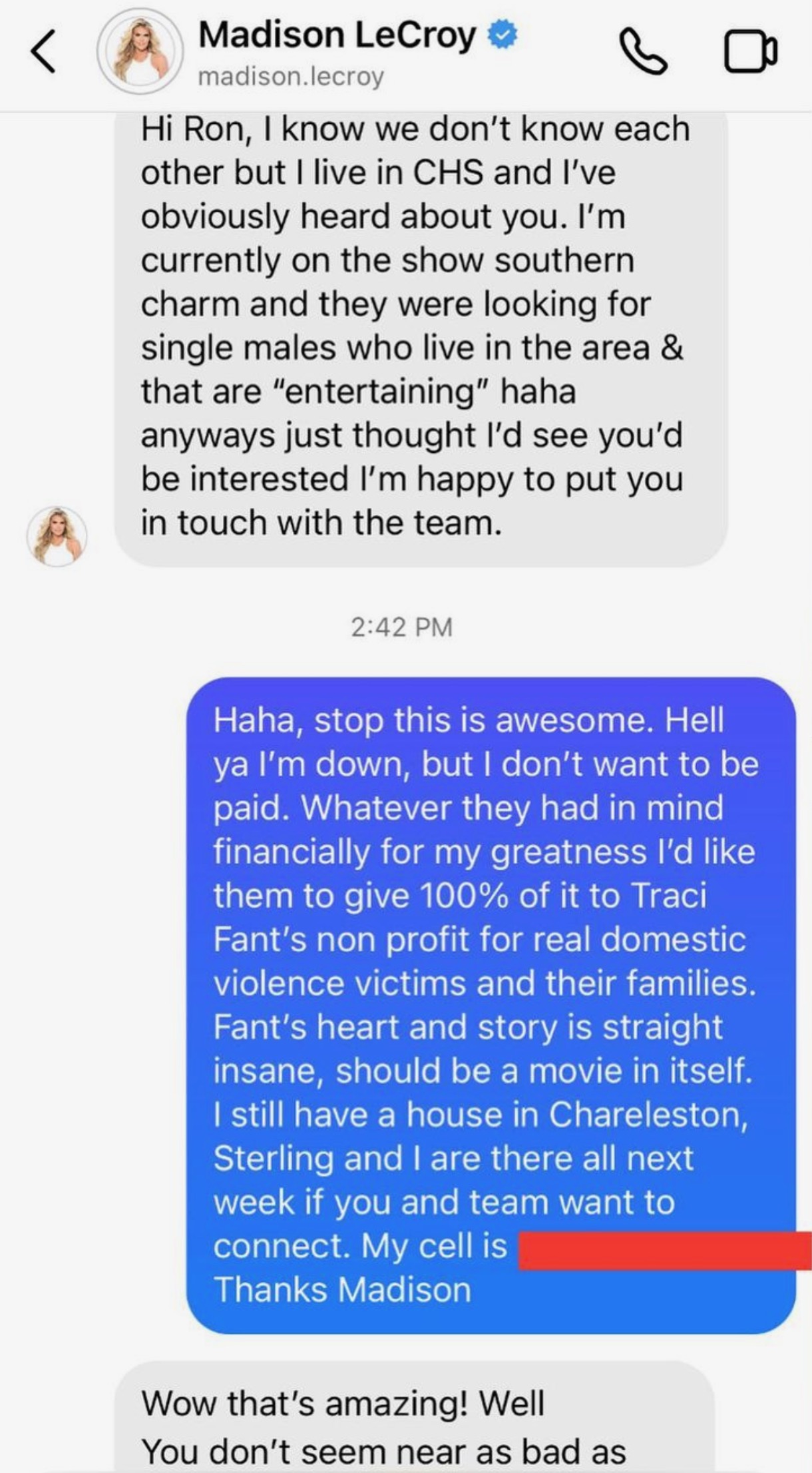 “Hi Ron, I know we don’t know each other but I live in (Charleston) and I’ve obviously heard about you,” LeCroy wrote in her message to Rallis. “I’m currently on the show Southern Charm and they were looking for single males who live in the area and that are ‘entertaining’ haha anyways just thought I’d see (if) you’d be interested I’m happy to put you in touch with the team.”