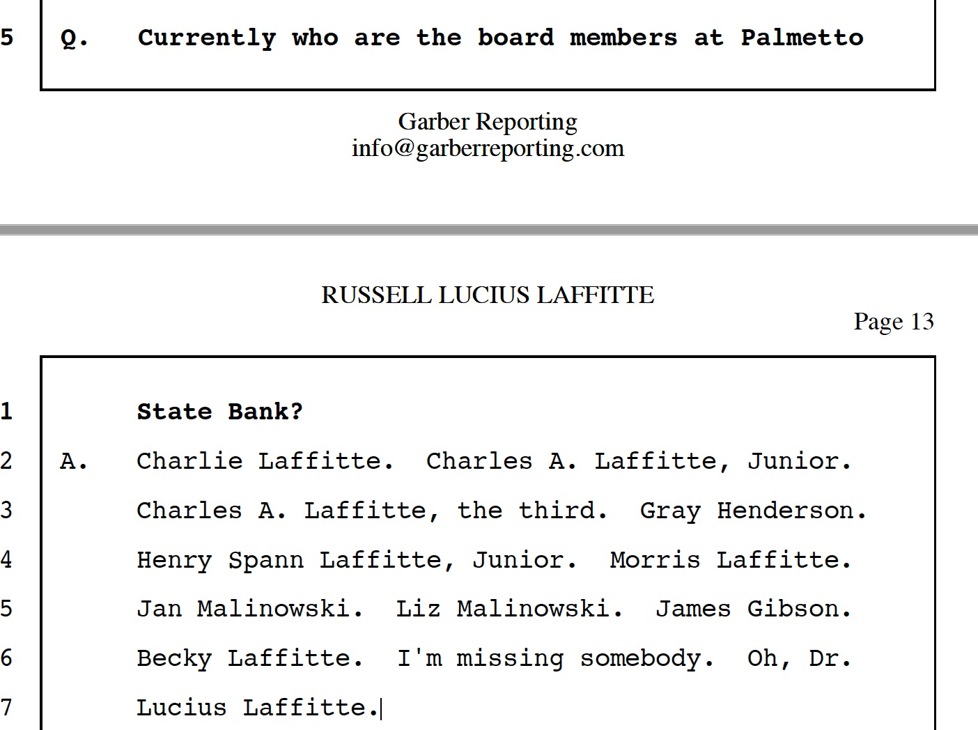 In his February 24, 2022 deposition tied to a Murdaugh-related wrongful death case, Laffitte made several comments related to others at the financial institution he formerly led – Palmetto State Bank (PSB).