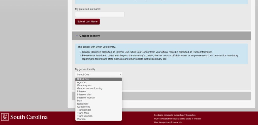 After providing data entry fields for students to enter their preferred first and last names, a dropdown menu offered the following thirteen gender options …