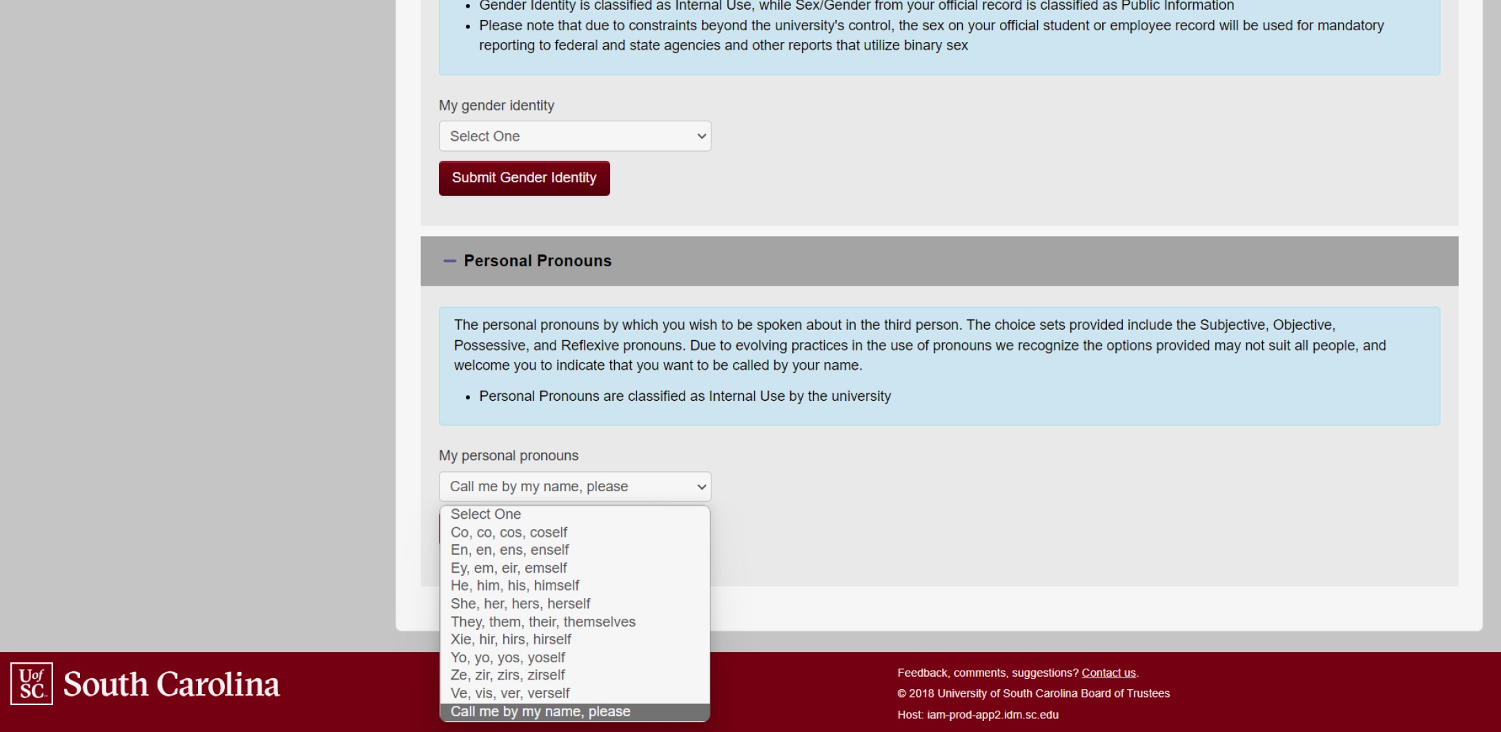 After providing data entry fields for students to enter their preferred first and last names, a dropdown menu offered the following thirteen gender options …