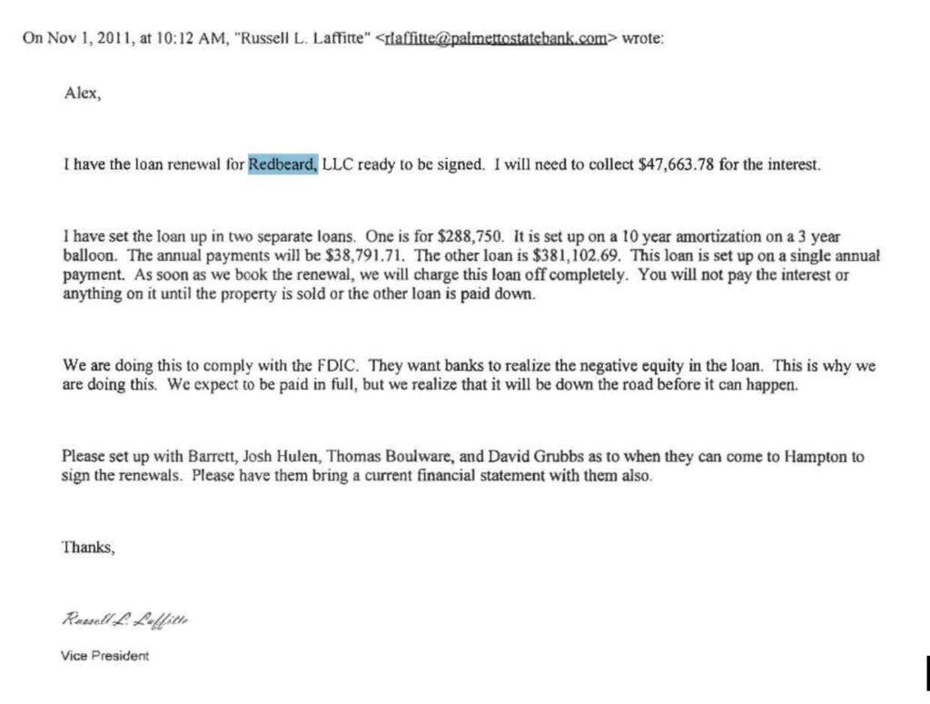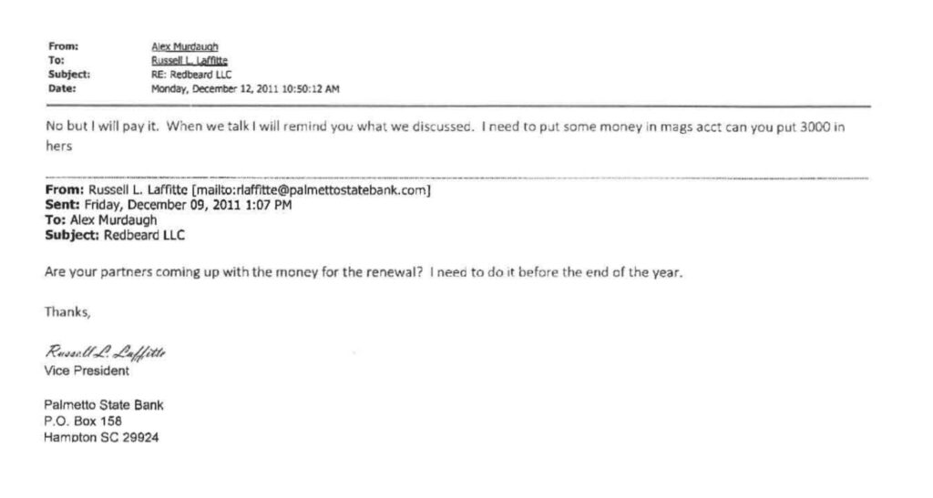 Limehouse continued her questioning by asking about an email sent from Laffitte to Murdaugh in early November 2011 about loans made to Redbeard and Zero United, two Murdaugh-related entities.