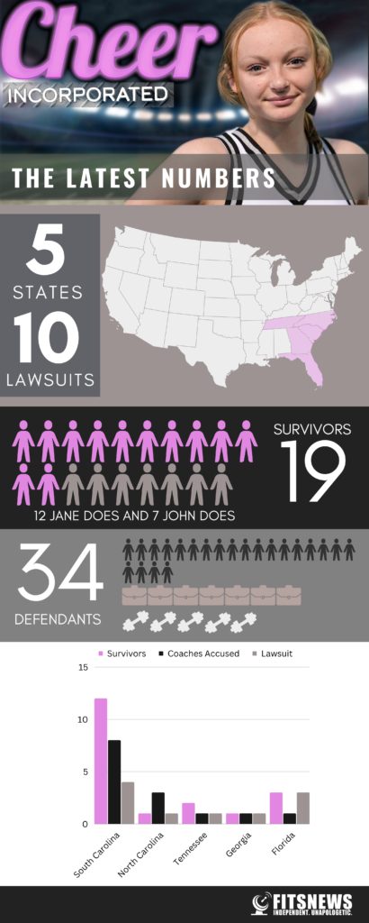 There are now a total of ten lawsuits filed in five states on behalf of nineteen survivors. Those suits name a combined thirty-four defendants – with each suit including the same core group of six defendants (Varsity, Webb, USASF, USA Cheer, Charlesbank and Bain).