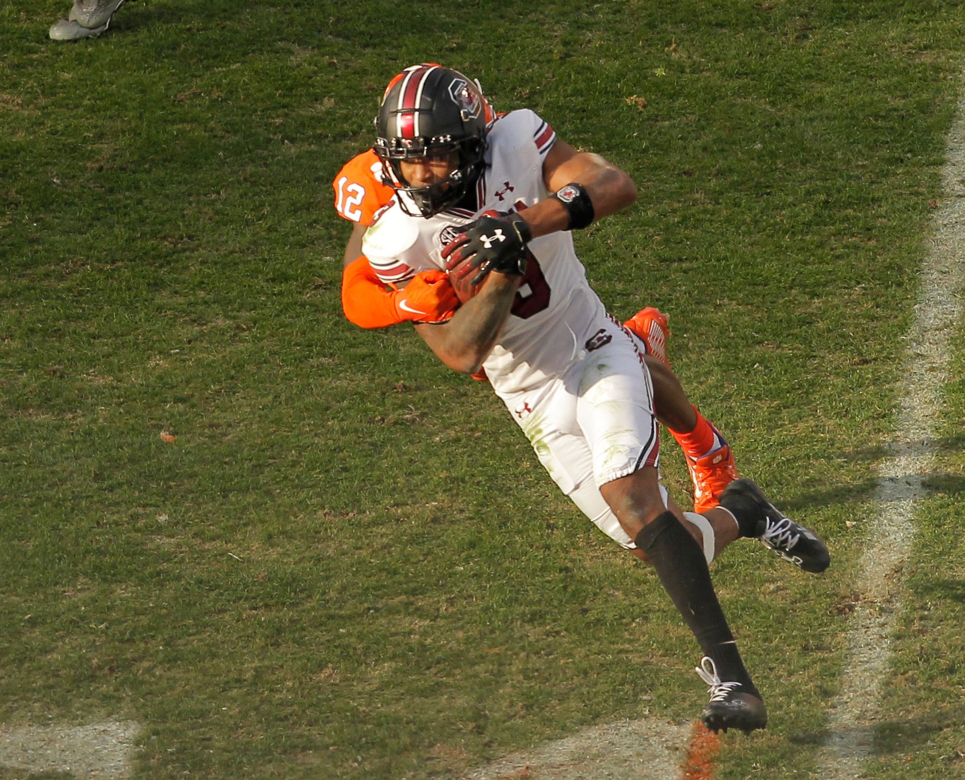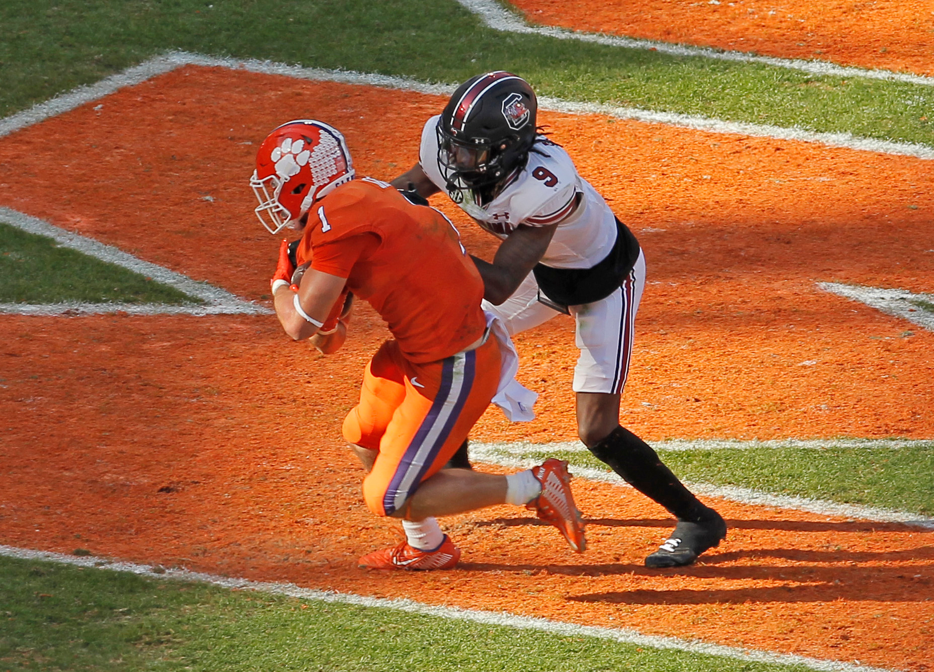 In the shadow of a seven-game skid in this long-running rivalry – not to mention the Tigers’ 40-game home winning streak (the longest active home winning streak in all of college football) – much-maligned starting quarterback Spencer Rattler hit junior wideout Antwane “Juice” Wells Jr. (above) in the flat for a five-yard gain to give the Gamecocks the game-clinching first down.