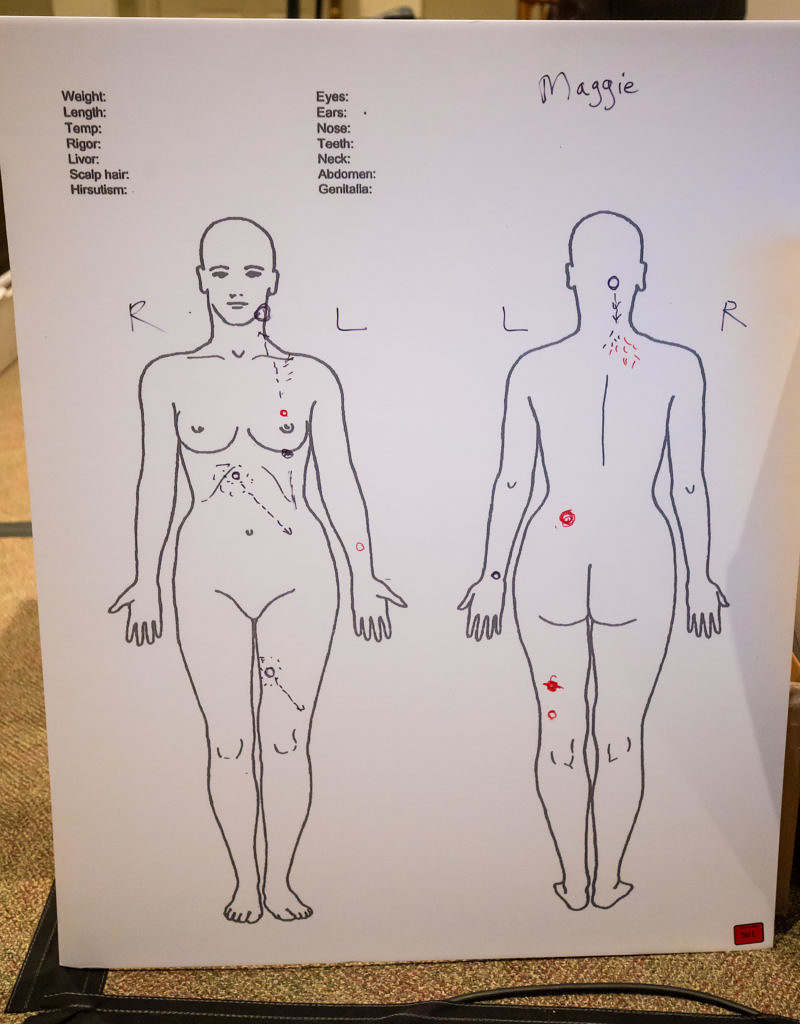 5:10 p.m. EST – Maggie was also shot through her left wrist. A fourth gunshot entered on the side of her left breast exiting on the top of her left chest. This bullet traveled upward and continued through the left side of her face and lower ear area. This fourth shot would have been immediately fatal as it entered her brain. Neither the wrist wound nor the head wound had stippling.