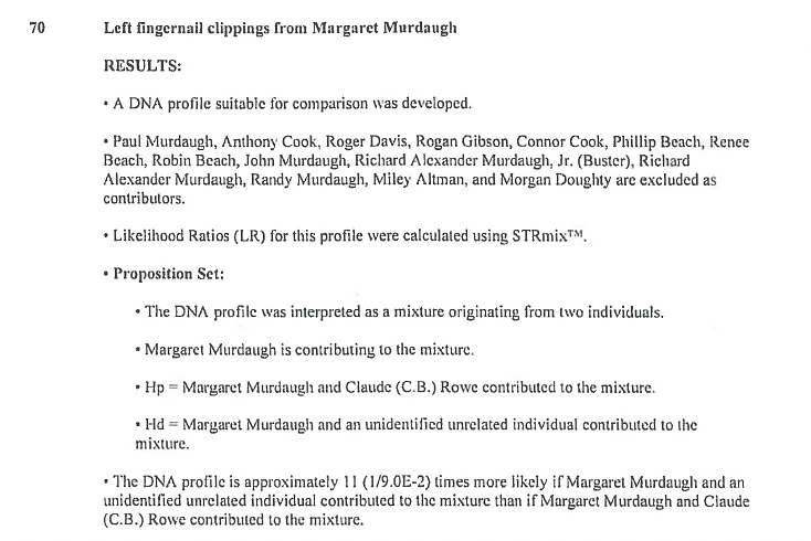 12:28 p.m. EST – Zapata explains that Claude “CB” Rowe was included in the analysis because she could not say from looking at his DNA profile and comparing it to the evidence that he could be excluded. When that happens, she runs the statistics to compare them to that profile and that’s why that comparison was made. The result of that comparison is the DNA profile is approximately 11 times more likely if Margaret Murdoch and an unidentified, unrelated individual contributed to the mixture than if Margaret Murdaugh and CB Rowe contributed to the mixture. She explains this is a result in support of that second scenario, not the first scenario like the others discussed. She further explains that she could not visibly exclude Rowe. The result supported that contributors were Maggie Murdaugh and an unknown, unrelated individual.