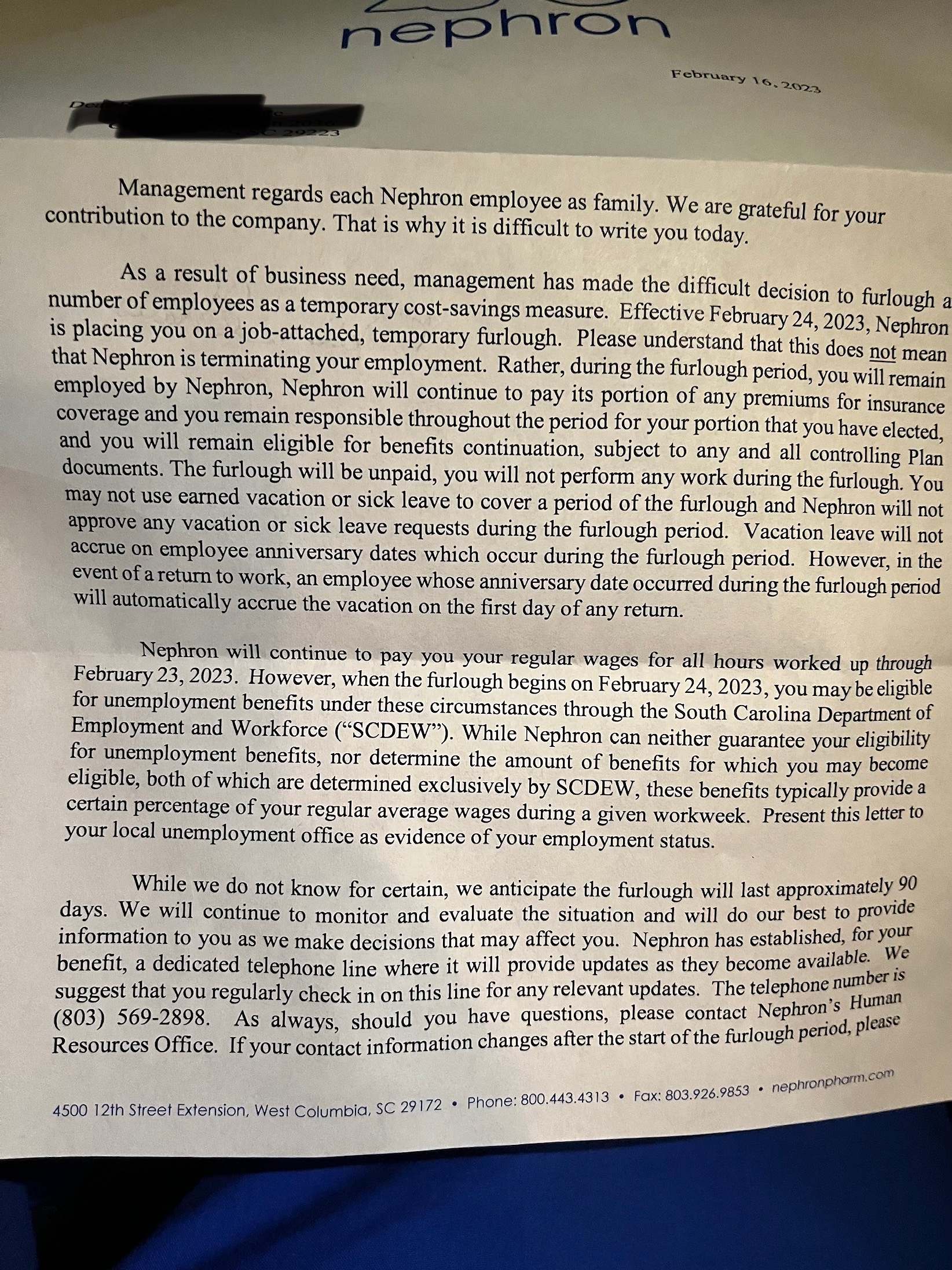 Nephron began delivering these letters to employees and providing them with notification of the layoffs/ furloughs on Thursday afternoon (February 16, 2023) at around 4:00 p.m. EST, according to company sources.