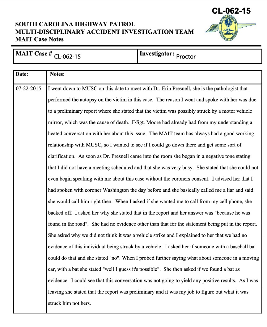 SCHP investigators questioned Presnell about her conclusion – but got nowhere. On July 22, 2015 – twelve days after Smith’s death – Proctor tried to speak to Presnell about why she settled on the “hit-and-run” explanation, but was rudely rebuffed.