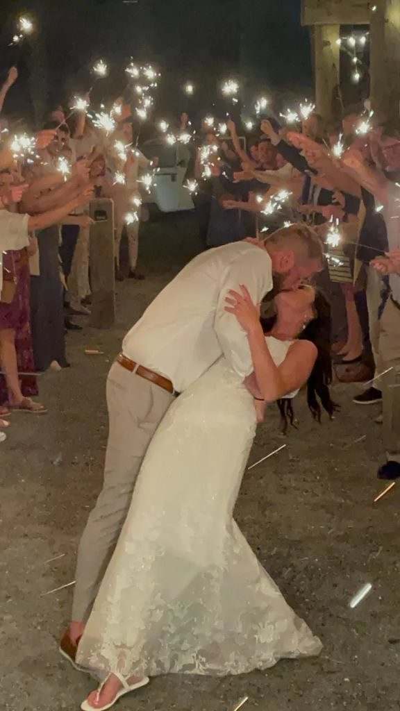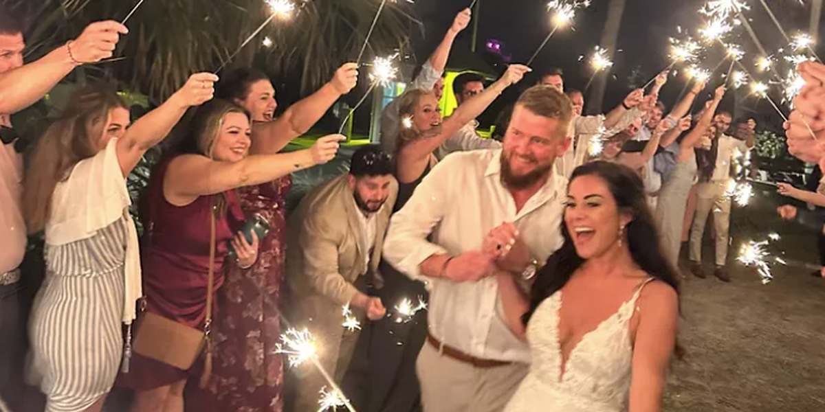 The photos posted to social media show a radiant bride and dashing groom celebrating a romantic kiss – the joyous moment illuminated by dozens of sparklers held aloft by family and friends surrounding the happy couple.