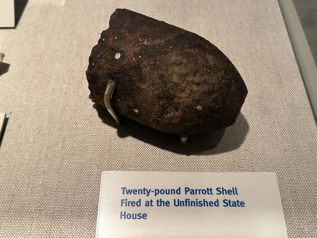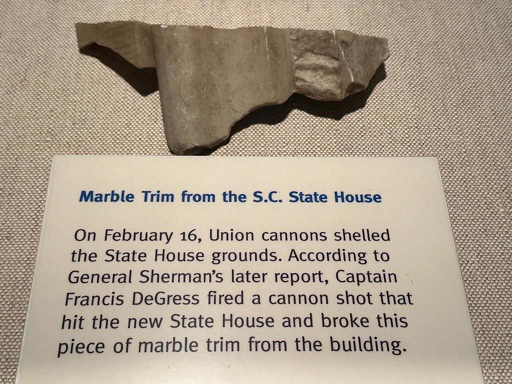 As its name suggest the museum also features, well, relics. Among them? A twenty-pound parrot shell fired at the unfinished S.C. State House in 1865 as well as a chip of marble from the damaged building …