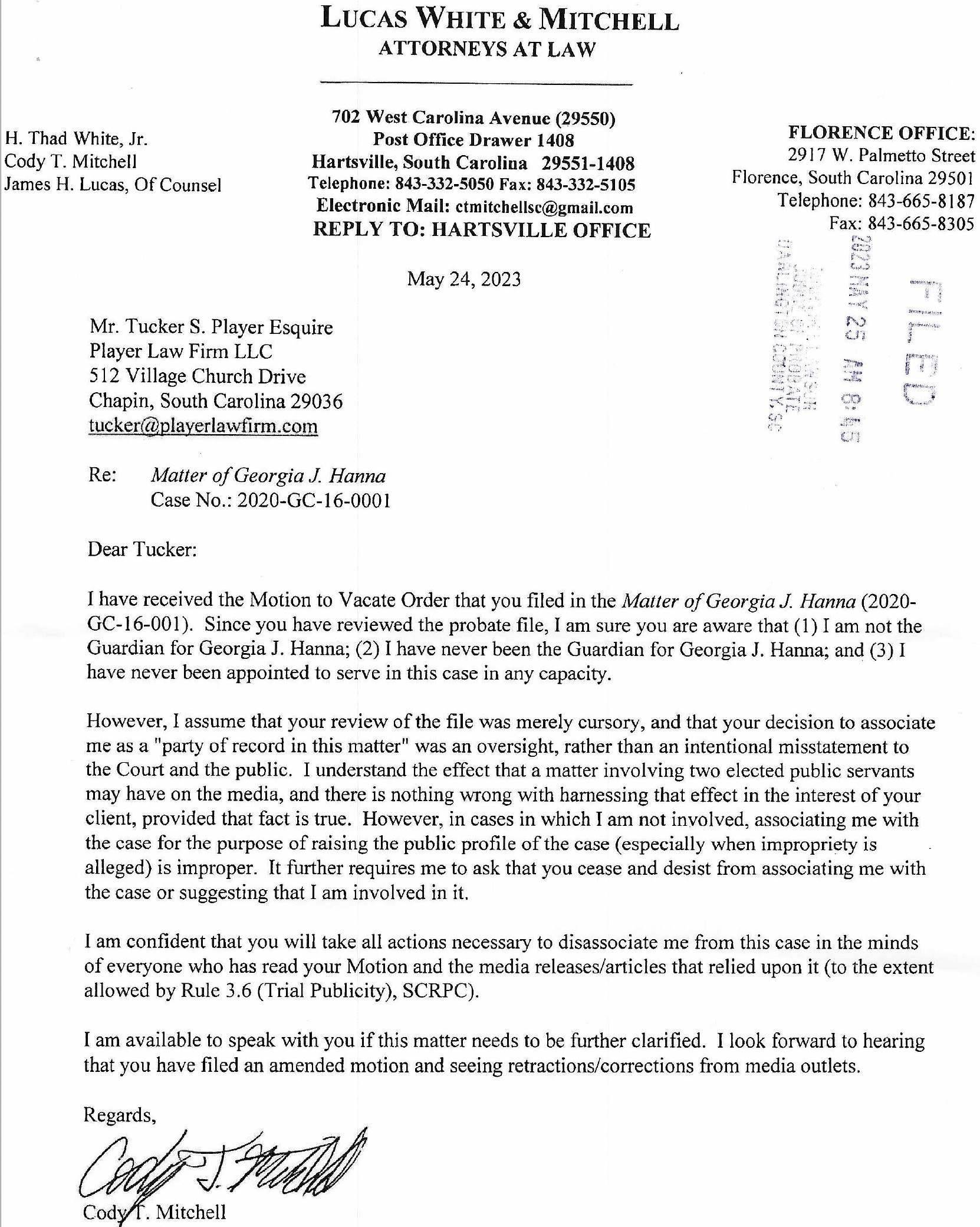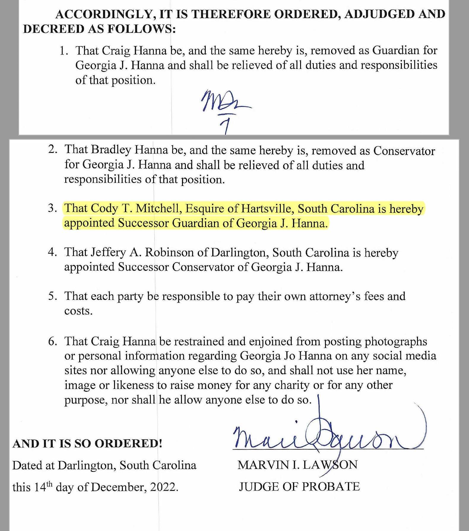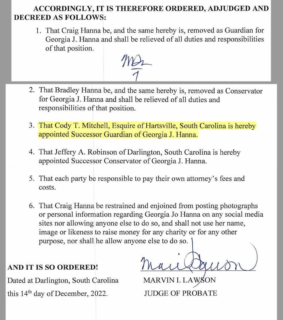 Lawson’s new order also accepted the resignation of Darlington County treasurer Jeffrey Robinson, who was serving as the court-appointed conservator in this case. He further sought to clarify the role of state representative Cody Mitchell – whom he previously appointed to serve as Jo Hanna’s guardian.