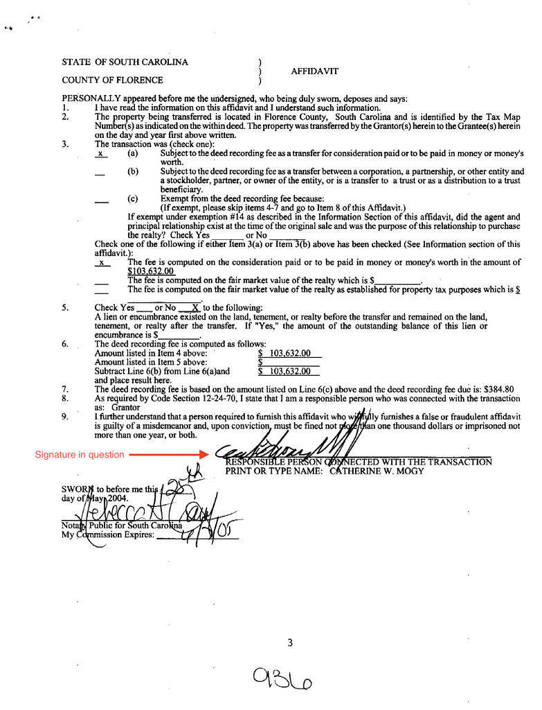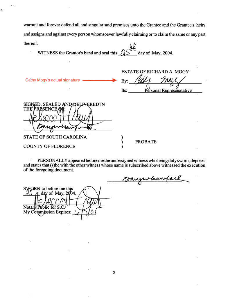 For example, contained therein was a deed for a property transferred on May 25, 2004 for $103,632 to Cecil Edward Floyd Jr. (a.k.a. “Bubby”). When Cathy Mogy looked at her signature on the affidavit attached to the deed, she realized it was not her signature. In fact, it didn’t even look like her signature. And the witness who notarized it? Gary Crawford’s wife, Rebecca Crawford.