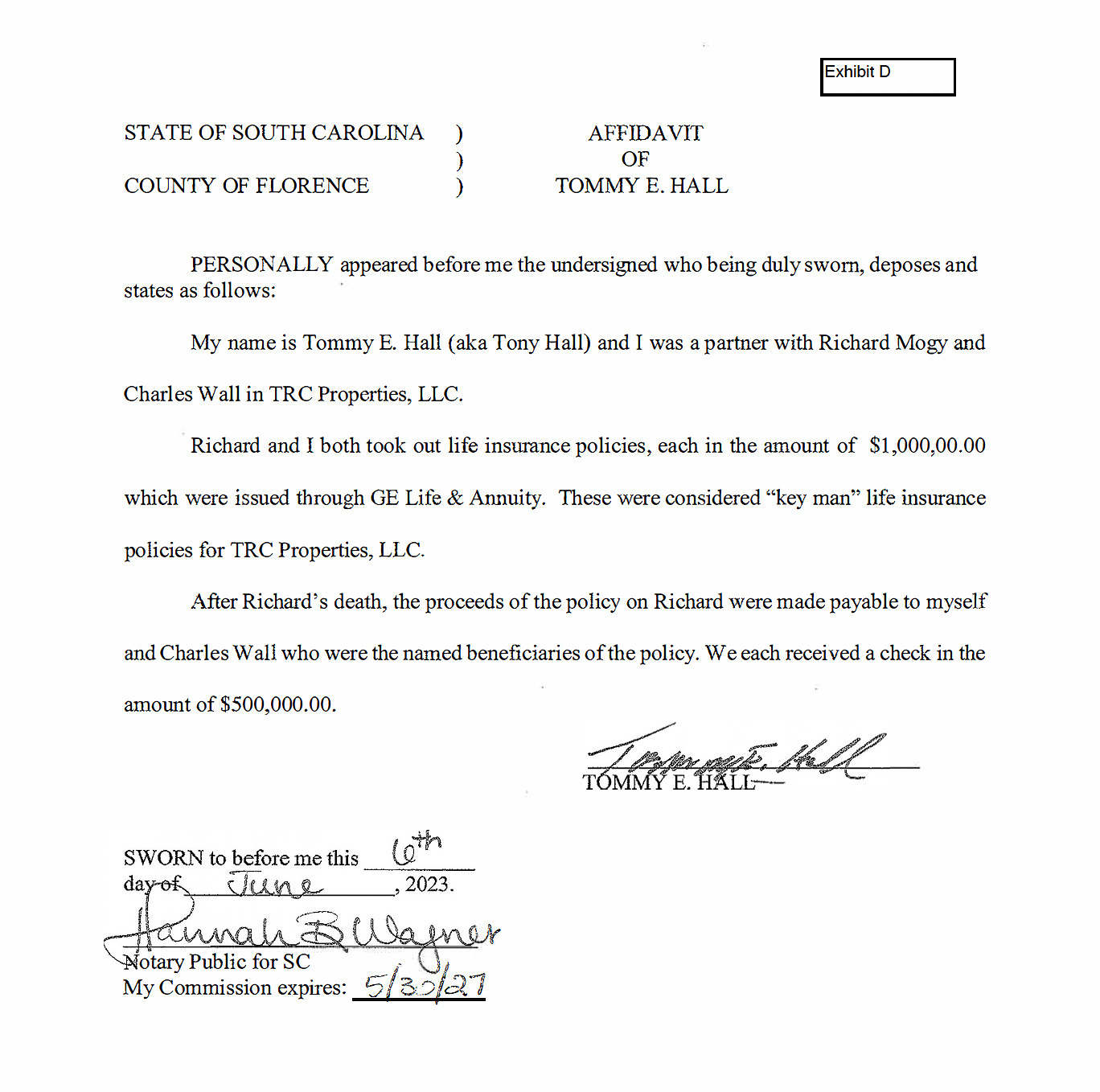 And the $1 million life insurance policy? According to an affidavit submitted by Richard Mogy’s former business partner, Tommy E. Hall, he and the remaining partner in the business received the money.