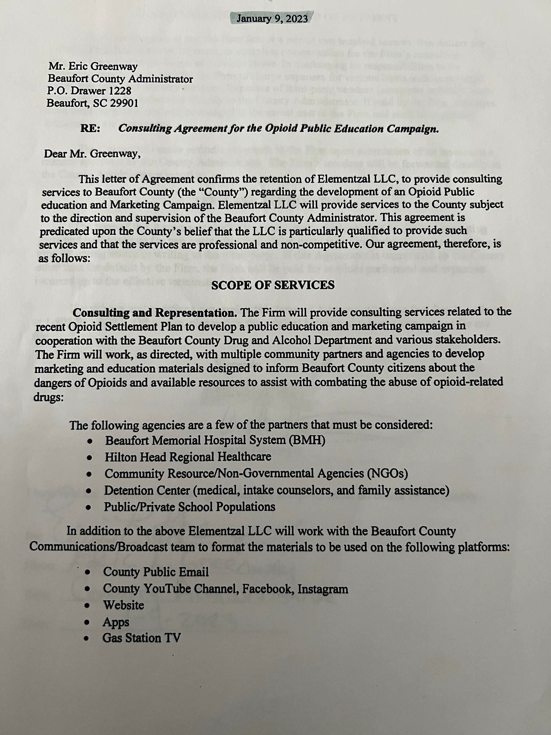 That document engages Elementzal to undertake an “opioid public education and marketing campaign” on behalf of the county.