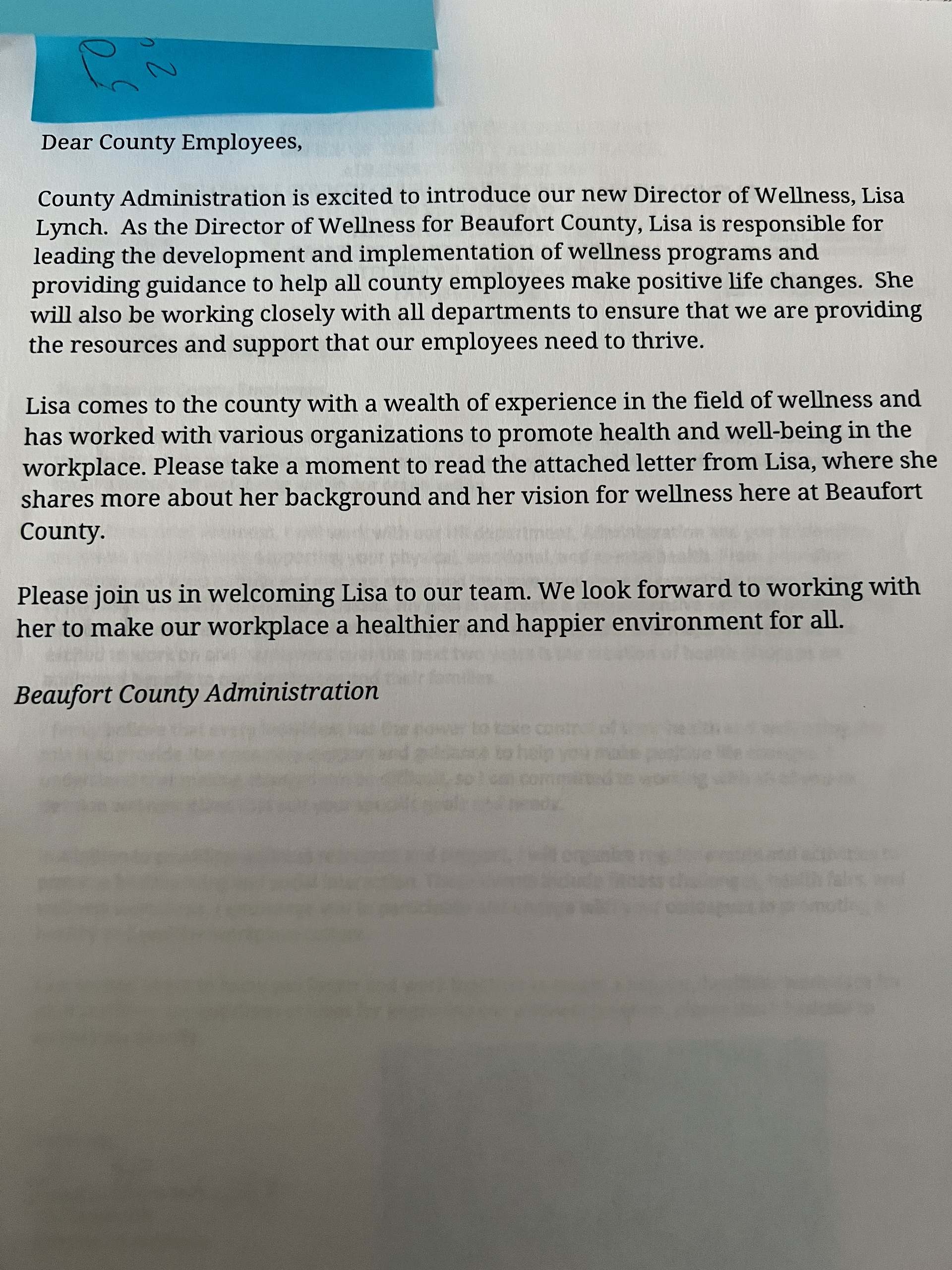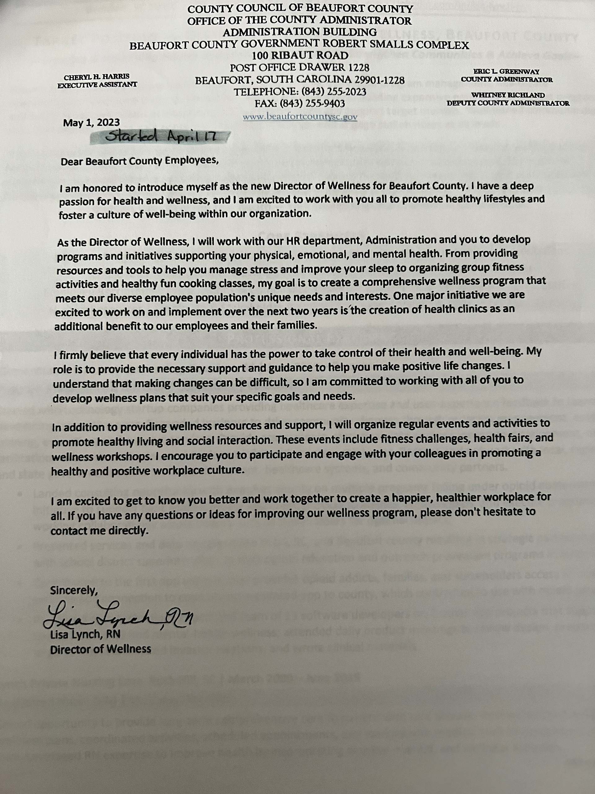 Lynch sent her own letter to employees introducing herself stating she was looking forward to “creating a comprehensive wellness program that meets our diverse employee population’s unique needs and interests.”