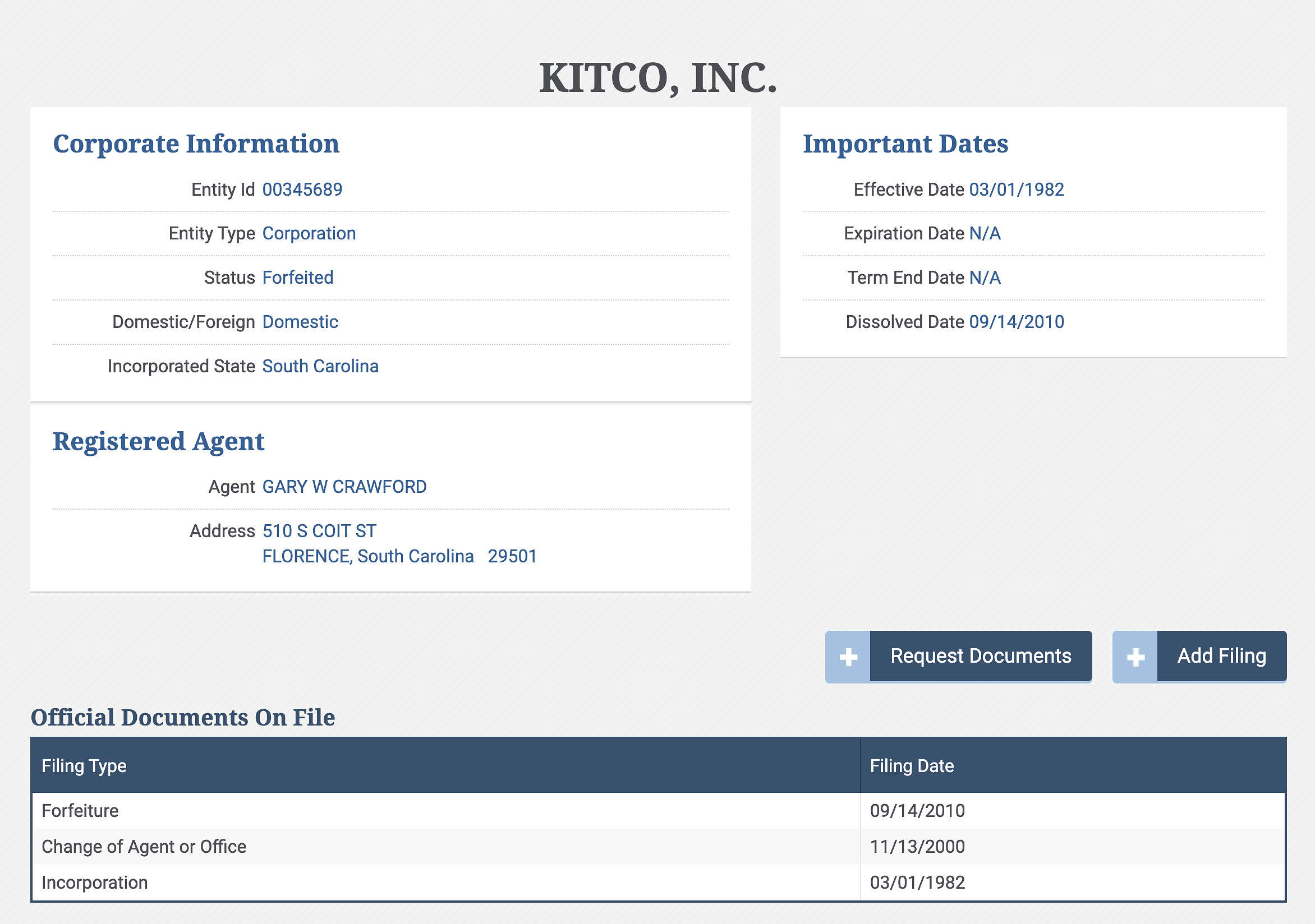 Incidentally, the company went into forfeiture on September 14, 2010, shortly after Baxley was elected to his role as circuit court judge.