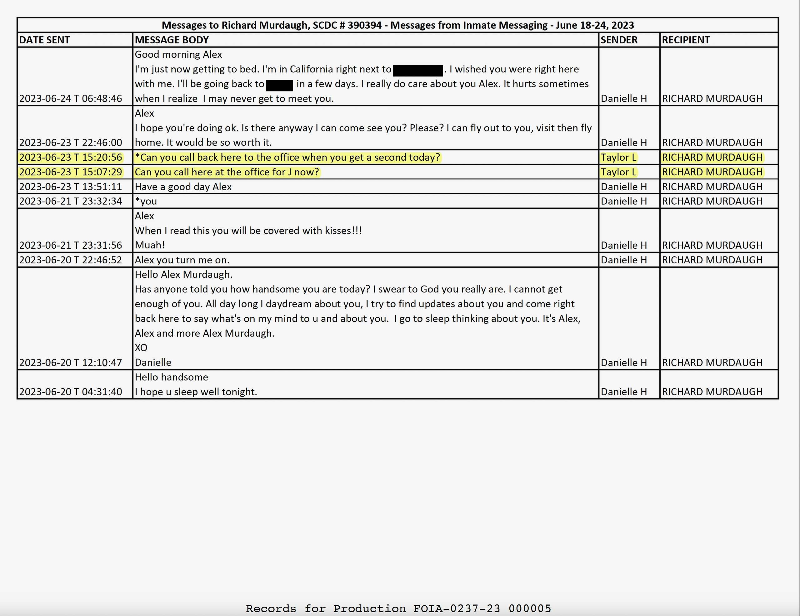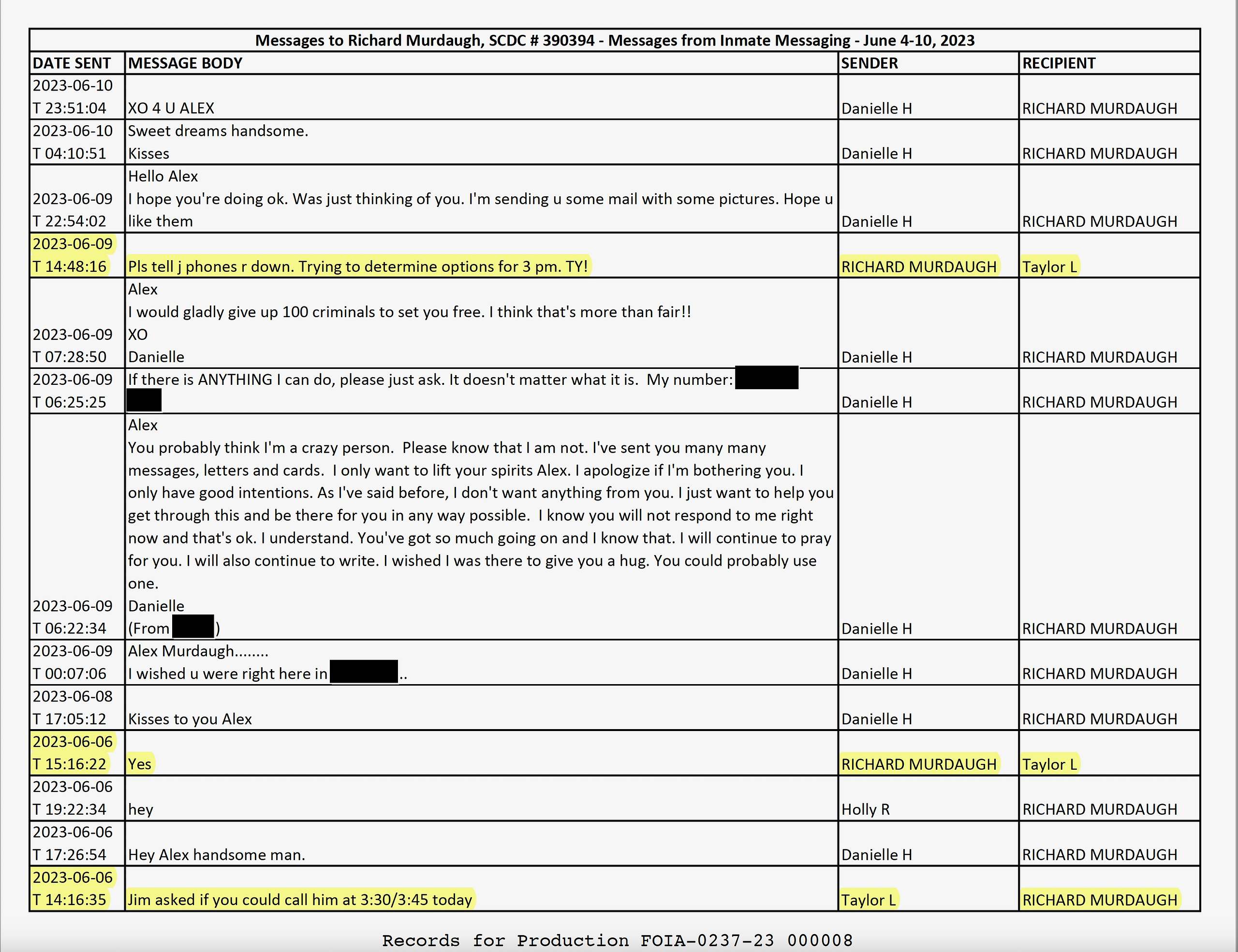 “Pls tell j phones r down,” Murdaugh wrote in one message to Taylor. “Trying to determine options for 3 pm. TY!”