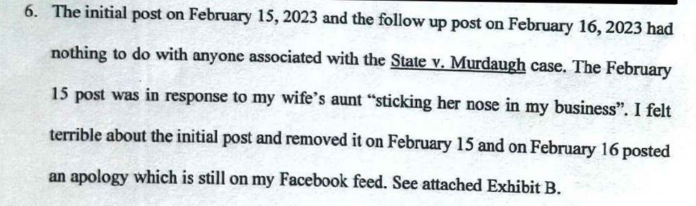 The existence of this Facebook post – allegedly made to the ‘Walterboro Word of Mouth’ group in mid-February – is central to the jury tampering motion presented by the defense. During the dismissal of the juror in question, no one was able to present the actual post to S.C. circuit court judge Clifton Newman. The only post presented in court was an apology post dated February 16, 2023 from a man with the same name as the juror’s ex-husband.