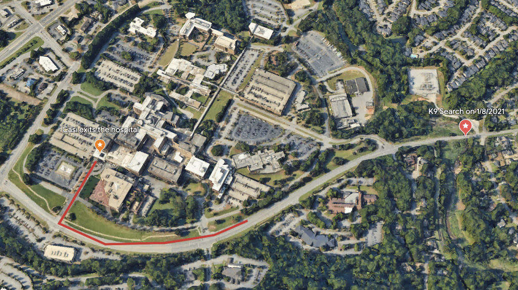 In an attempt to determine where Casi went after she was discharged, investigators reviewed surveillance camera footage from the hospital and determined she left the facility at 8:09 p.m. EDT. Immediately upon leaving, she approached a blue van parked at the hospital entrance and spoke briefly with the driver of the van.