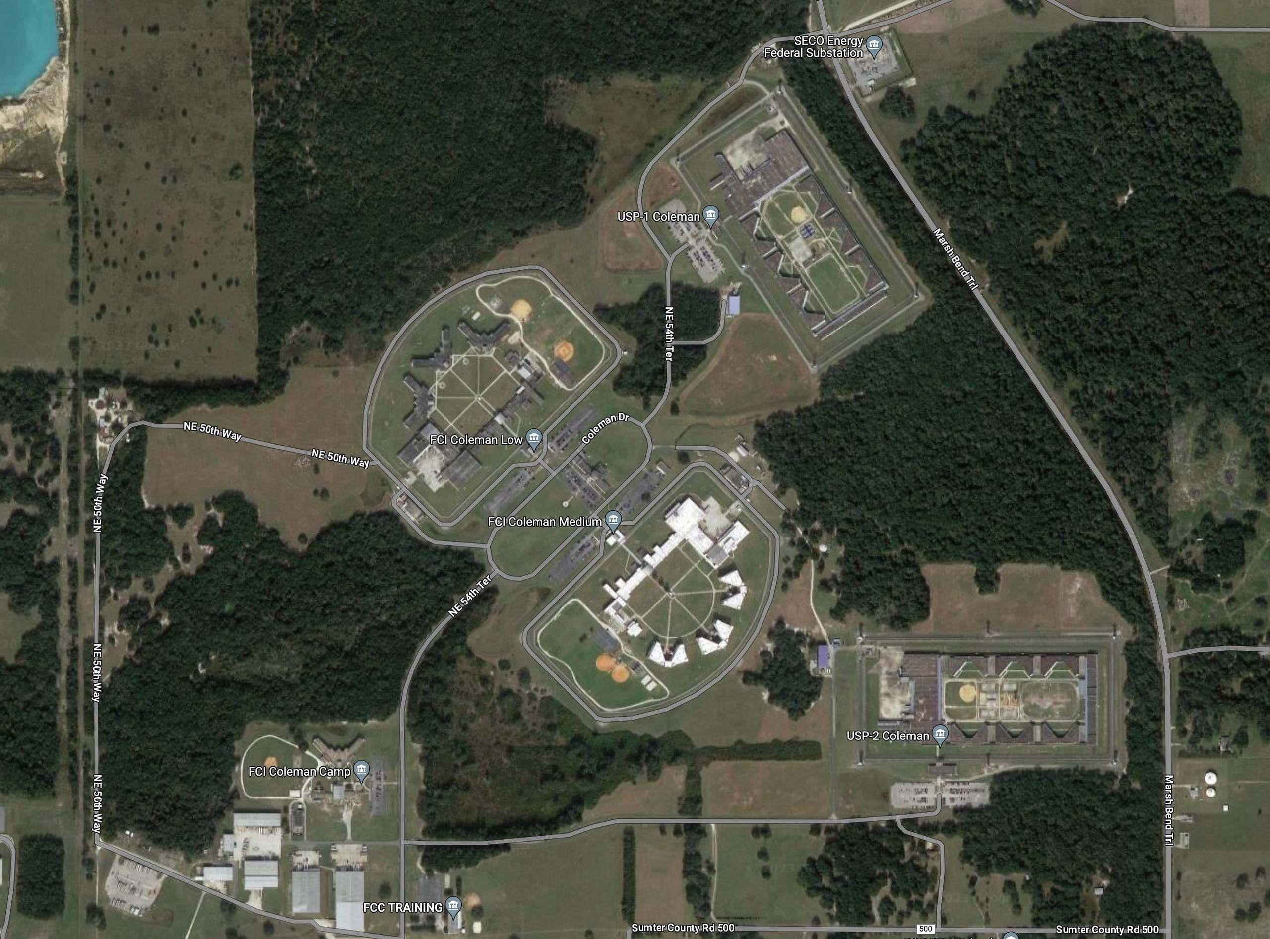 Located near the town of Wildwood in Sumter County, Florida, Coleman is administered by the U.S. Bureau of Prisons (BOP) – a division of the U.S. Department of Justice (DOJ). The complex sits on approximately 1,600 acres of land located approximately 50 miles northwest of Orlando.