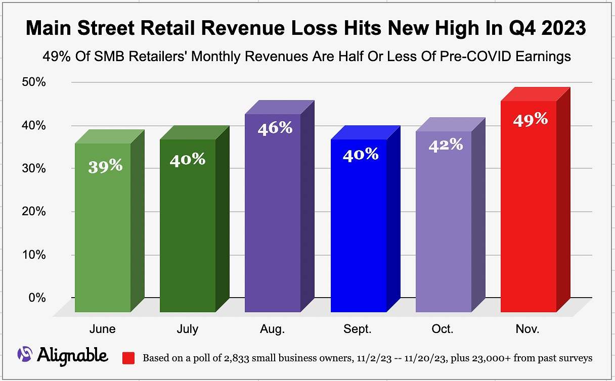 There’s a new report out this week from Alignable, a business networking platform, underscoring the hastening deterioration of America’s small business backbone. Beset by crippling inflation, expanding automation and the ubiquitousness of national big box retailers, small- to mid-size businesses (SMBs) in America are limping into the holidays in worse shape than ever before.