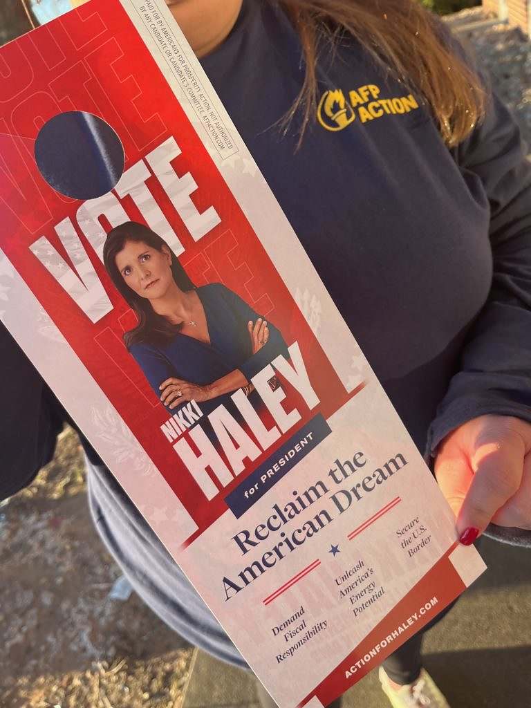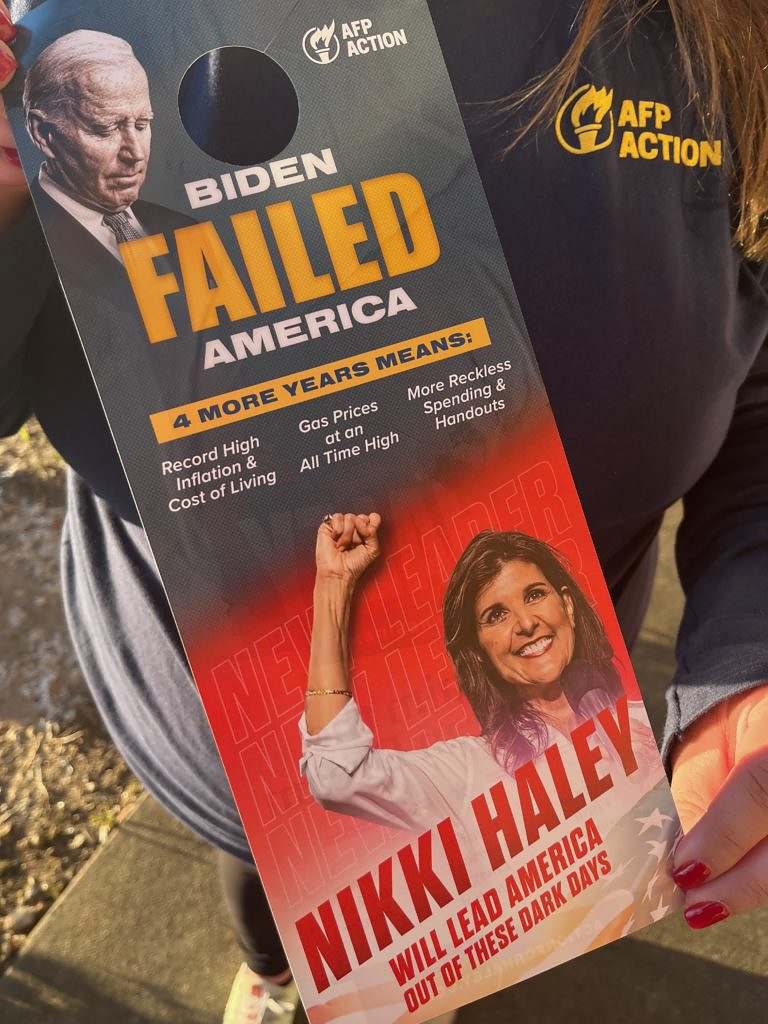 Armed with door hangers extolling Haley’s virtues and touting her electability against incumbent president Joe Biden, AFP Action volunteers selected homes of target voters based on apps loaded onto their smartphones.