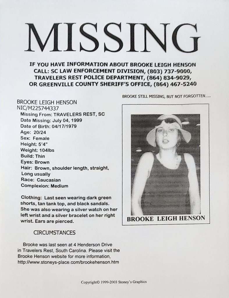 Even though it has been more than twenty years since Brooke Leigh Henson went missing, police in Travelers Rest, South Carolina haven’t stopped searching for her. Nor will they stop. Just last month, they searched the local water treatment plant with ground penetrating radar in response to a new tip in the case.
