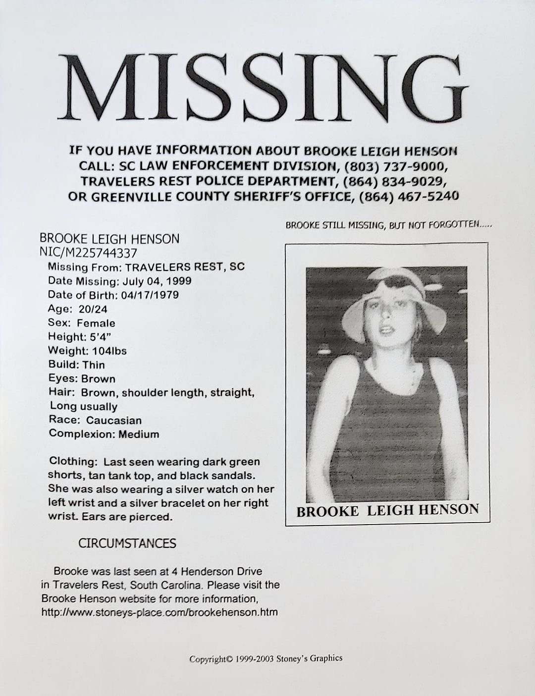 For Ford, though, the case has always been about Henson. Finding out what happened to her is a priority for the police chief and he hopes members of the public will come forward with whatever information they may have. Ford is convinced that there are several individuals who have information about the events leading up to her death on the night of July 4, 1999 – and her final destination. As police in Travelers Rest get ever closer to the answers they seek, this information could help bring peace to Brooke’s surviving brother and other friends and family members who are missing her still. He is asking those who know to help conclude the search that has lasted longer than her life.