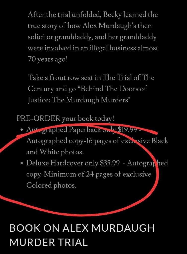 Otherwise, I repeat that South Carolina’s Attorney General, Solicitor Duffie Stone and the courts, should be conducting more investigations, specially into that juror who, according to Becky “Boo” Hill’s book, pages 58-60 got “thousands of dollars” from unnamed friends to stay on the jury instead of returning to work and getting replaced by an alternate.