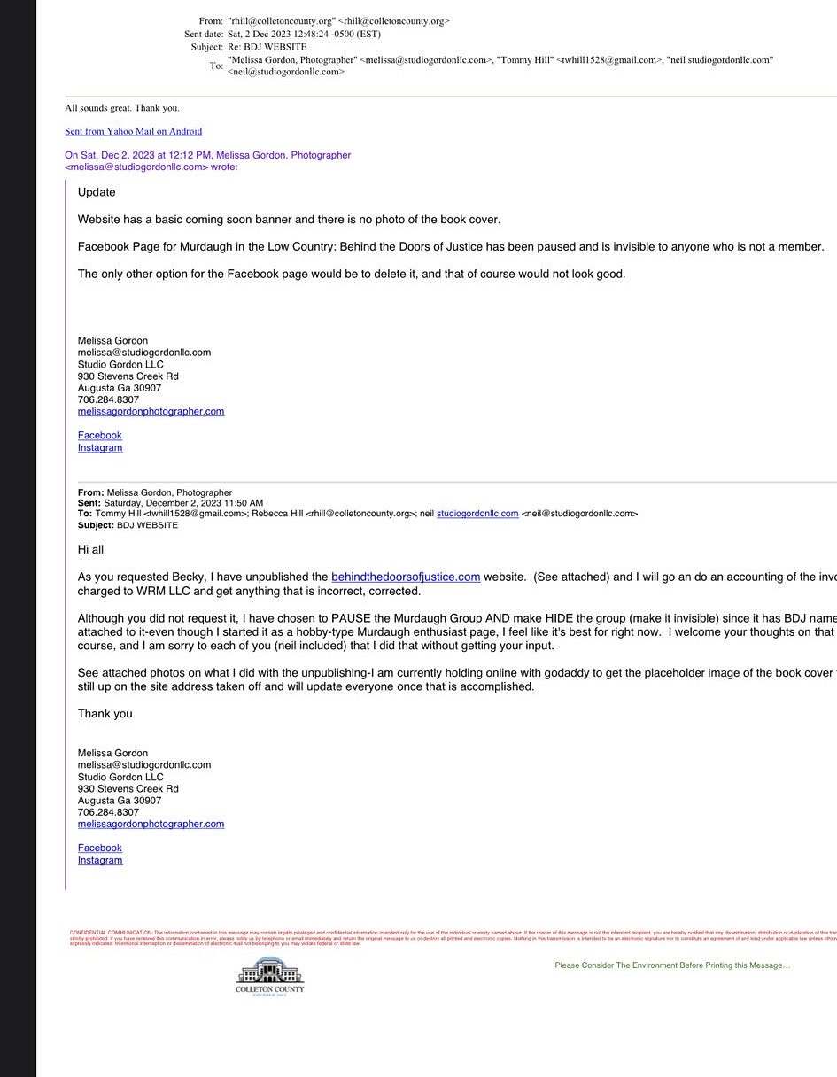 Earlier this month – as the details of all these investigations were becoming widely known – Hill appears to have directed a public purge of the website linked to her book. She also signed off on the muting of a Murdaugh Facebook page run by her business associates that was previously used to promote their book.