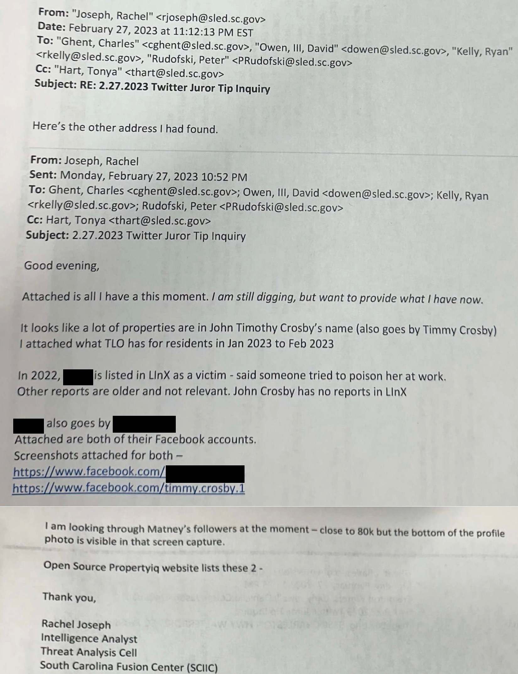 To add to this already confusing situation, FITSNews recently obtained an email sent during the trial between several SLED agents. In the email – dated February 27, 2023 – the agents discussed their investigation of a “Twitter Juror Tip” received related to the egg juror. This tip has never been mentioned in any court documents, but if it was indeed a separate tip – it would mean the egg juror was reported on at least three separate occasions through three different platforms.
