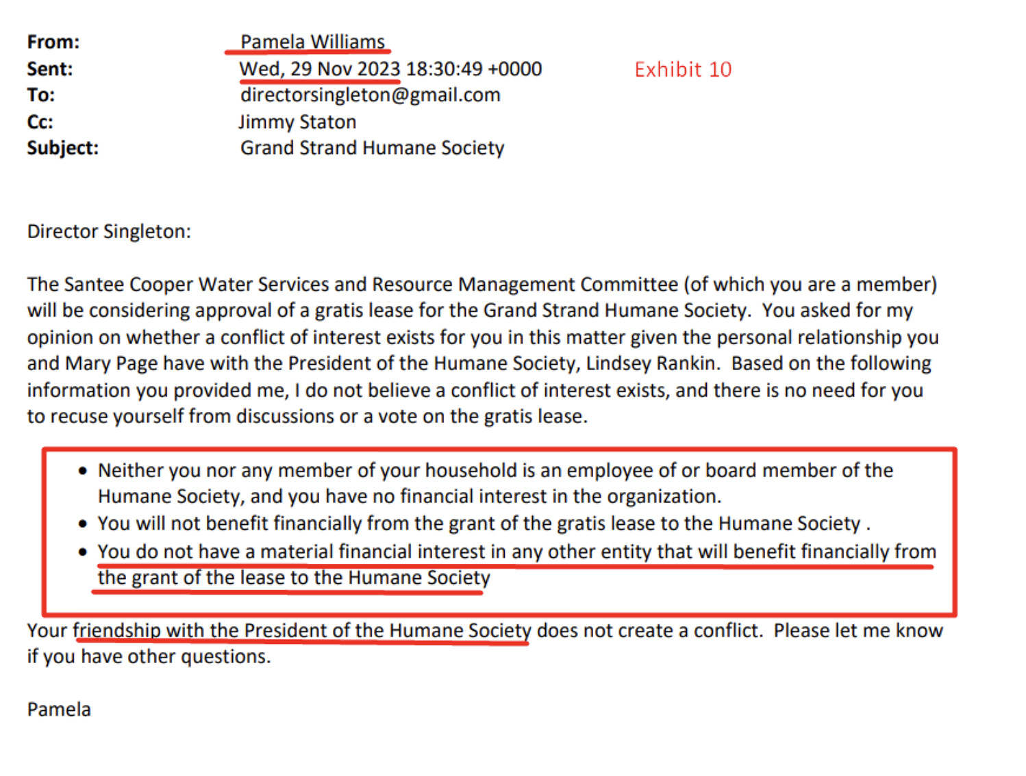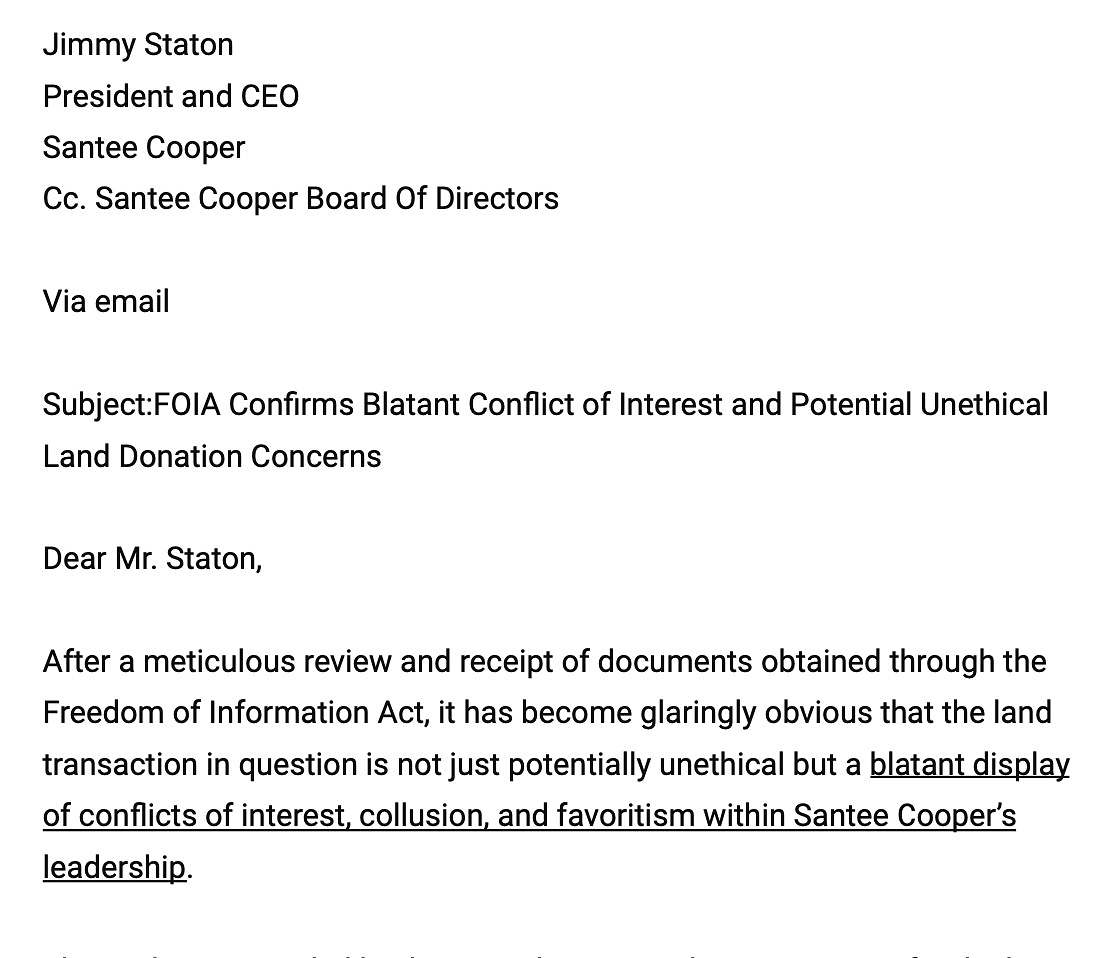 Despite the aforementioned alliances, though, Santee Cooper’s chief public affairs officer Pamela Williams concluded Singleton’s “friendship” with Lindsey did not constitute a conflict of interest as neither stood to “benefit financially” from a gratis lease.