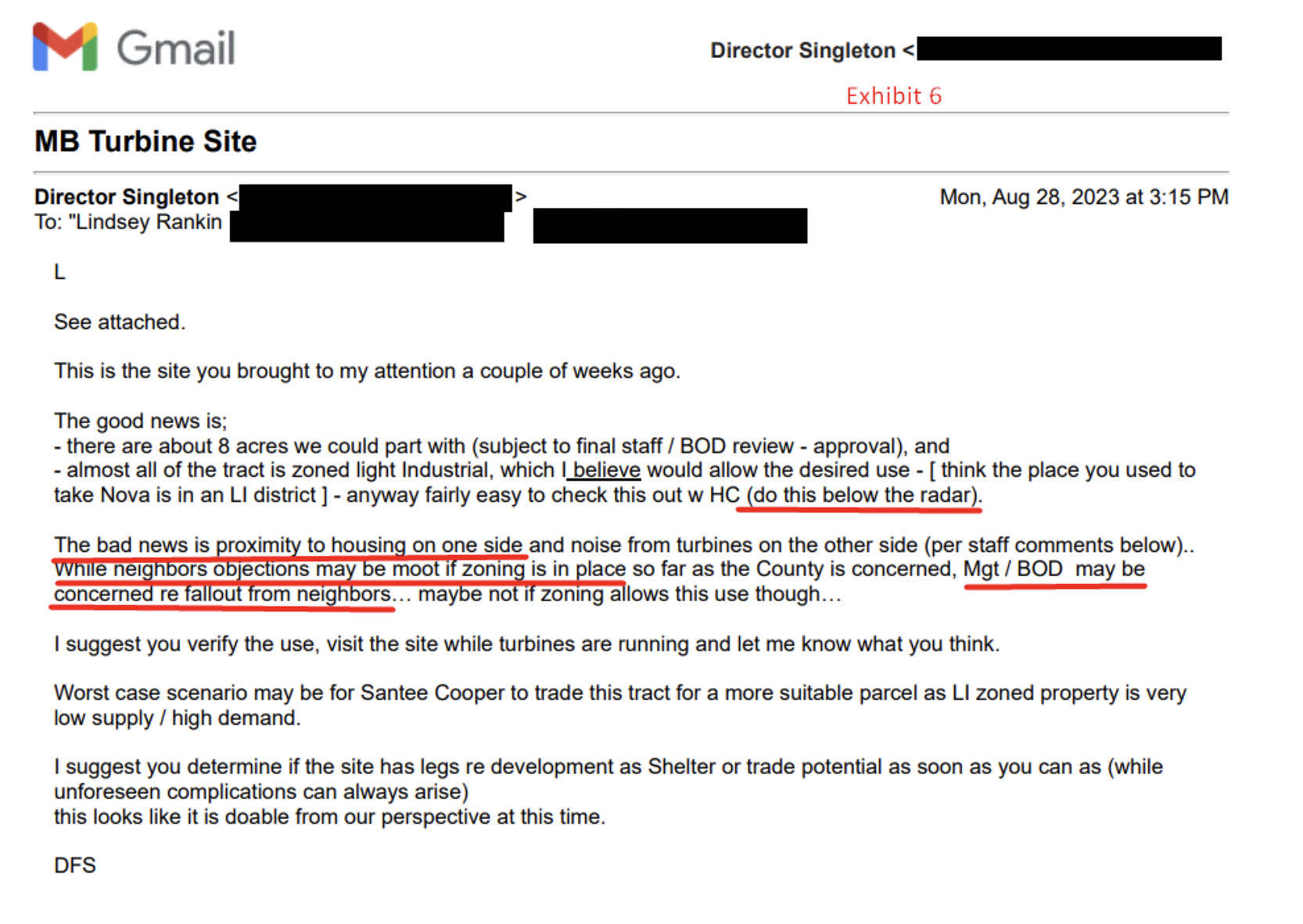 “Check this out [with Horry County] … do this below the radar,” Singleton wrote to Lindsey in August 2023 — as the site’s zoning was miraculously amended within the Horry County Planning Commission to enable the GSHS expansion.