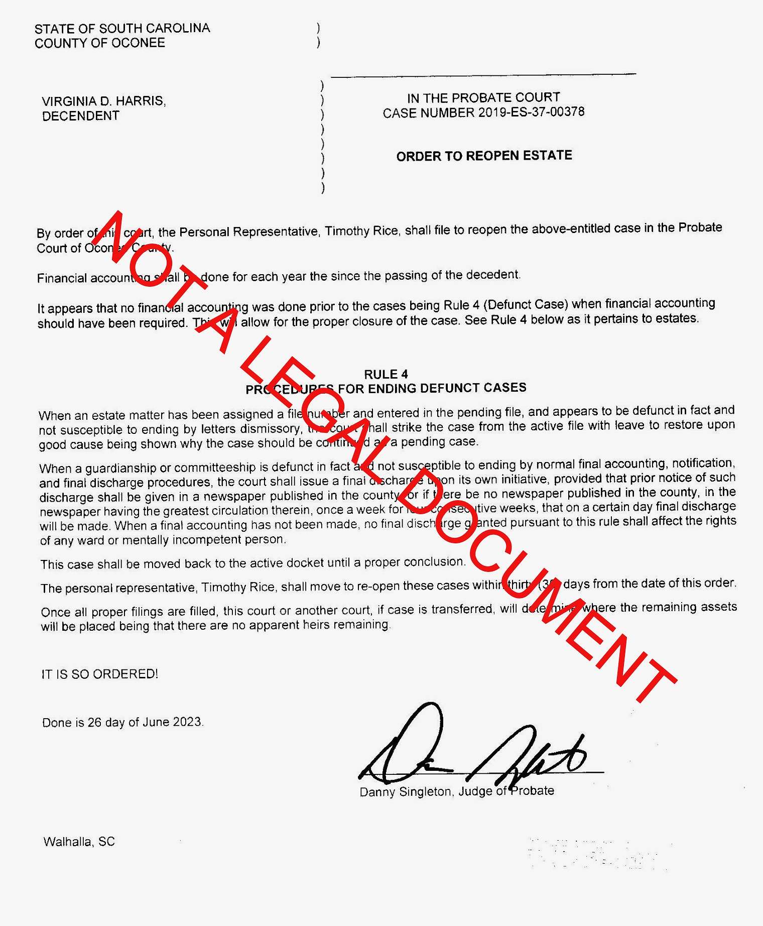 As of publishing, Rice has not notified Oconee County Probate Court of his schedule to reimburse the estate of Virginia D. Harris in the amount of $11,312.77 by Wednesday, April 24, 2024 — the deadline imposed by Singleton.