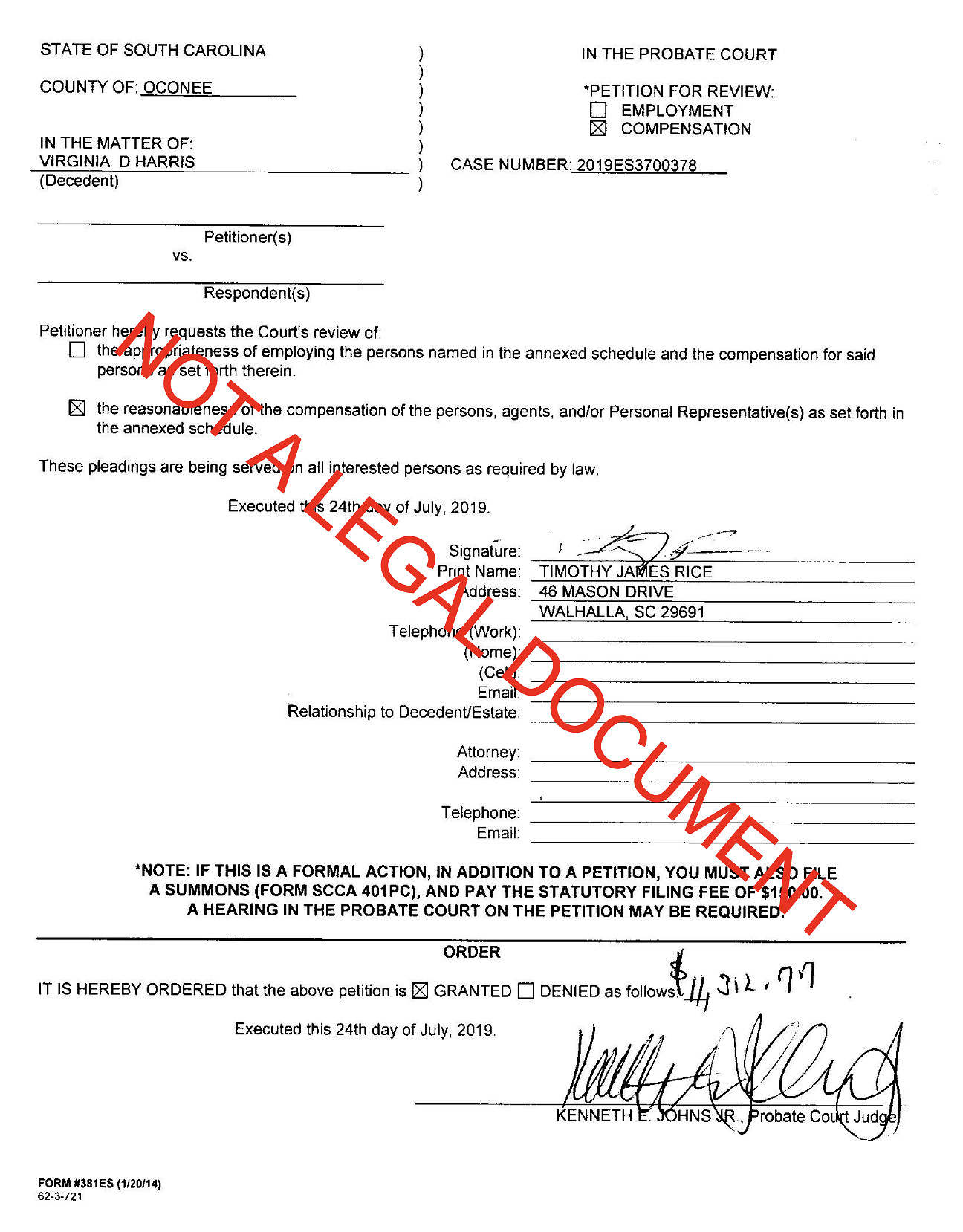 In unison, judge Johns approved Rice’s petition for compensation which was thereafter notarized by his wife and promptly collected in the form of a cashier’s check totaling $11,312.77.