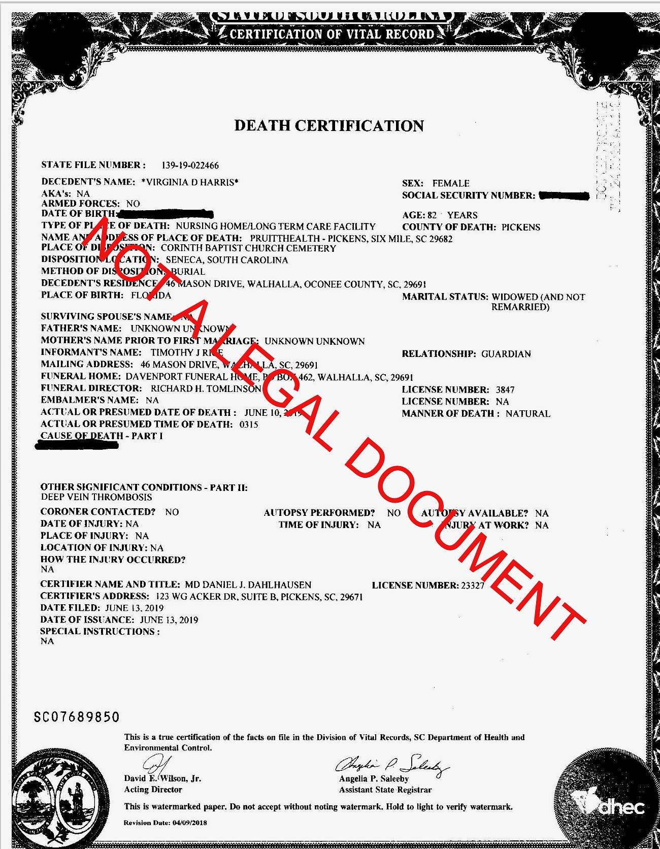 While serving as a child/elder abuse investigator for the OCSO, then-sergeant Rice was appointed as special administrator over Harris’ estate within hours of her recorded passing at PruittHealth-Pickens on June 10, 2019.
