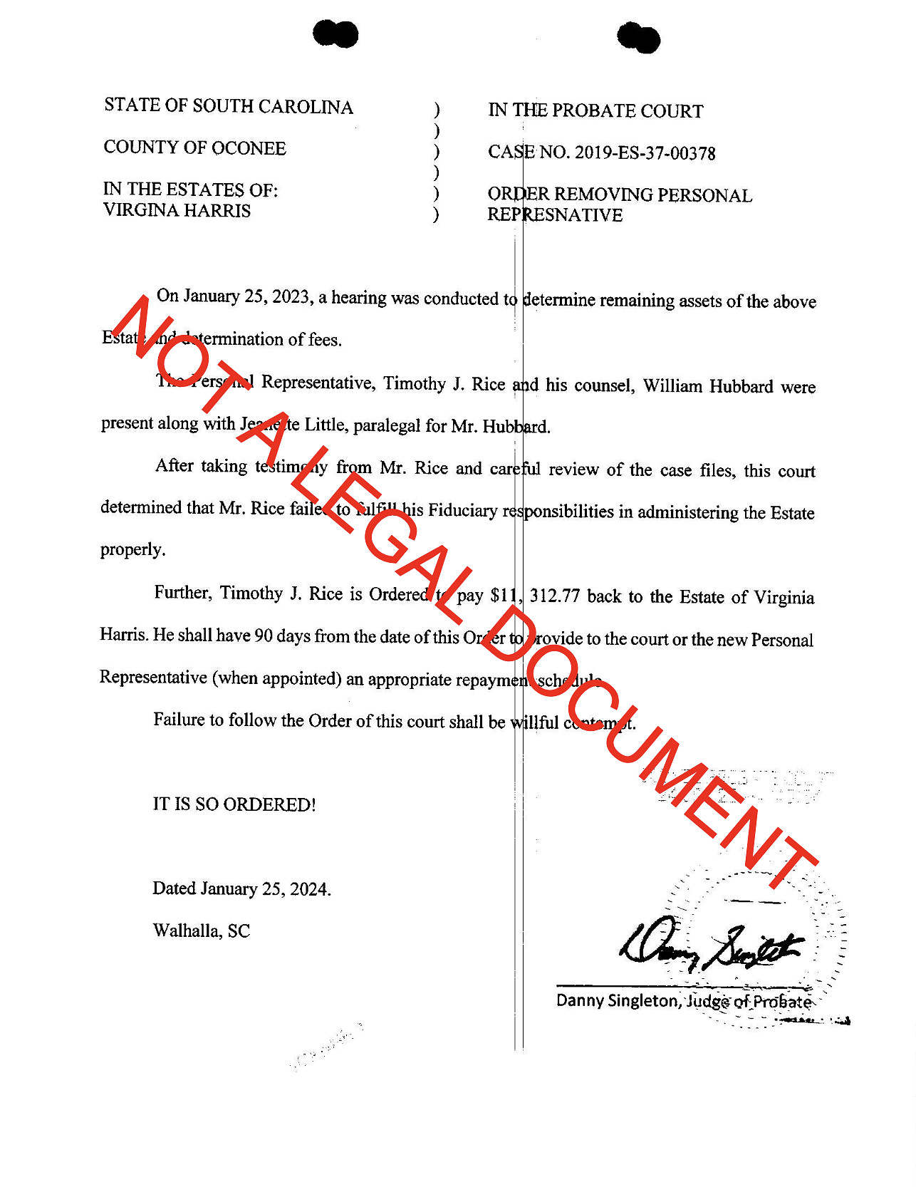 On January 25, 2024, Singleton held an assertive hearing in which Rice and his attorneys failed to provide adequate explanations for his five-figure compensation and subsequent abandonment of Virginia’s estate.
