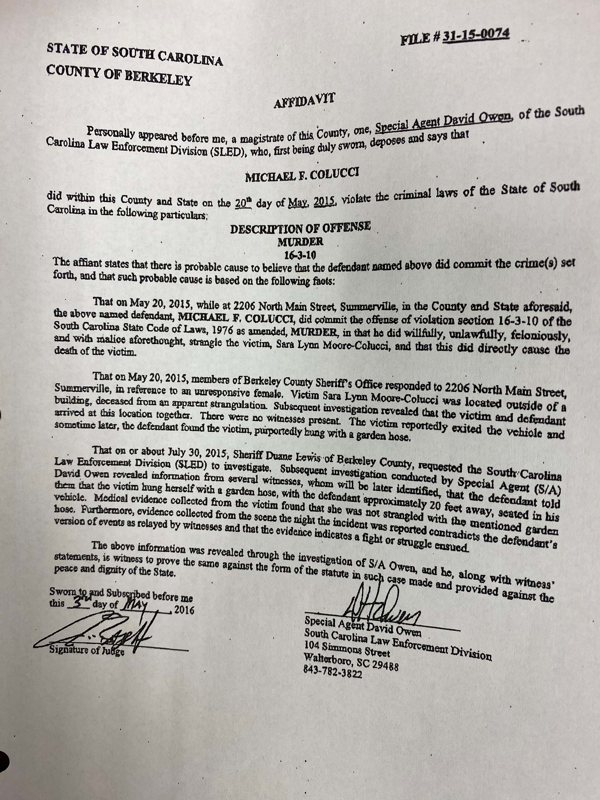 Initially investigated by the Berkeley County sheriff’s office, this case later fell to the S.C. State Law Enforcement Division (SLED) – which ultimately arrested Colucci and charged him with murder on May 4, 2016.
