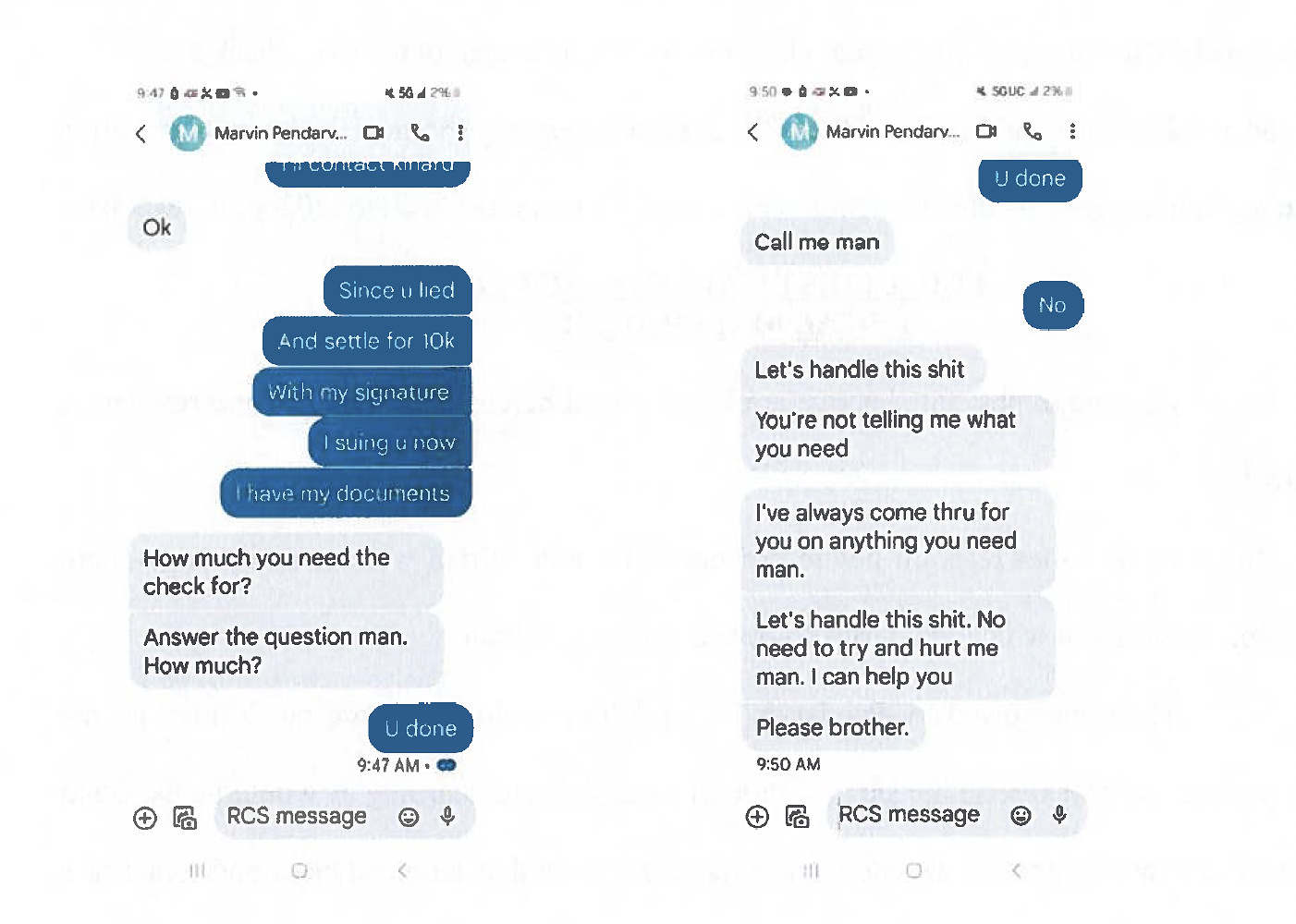 “Let’s handle this shit,” Pendarvis wrote in another message. “You’re not telling me what you need.”