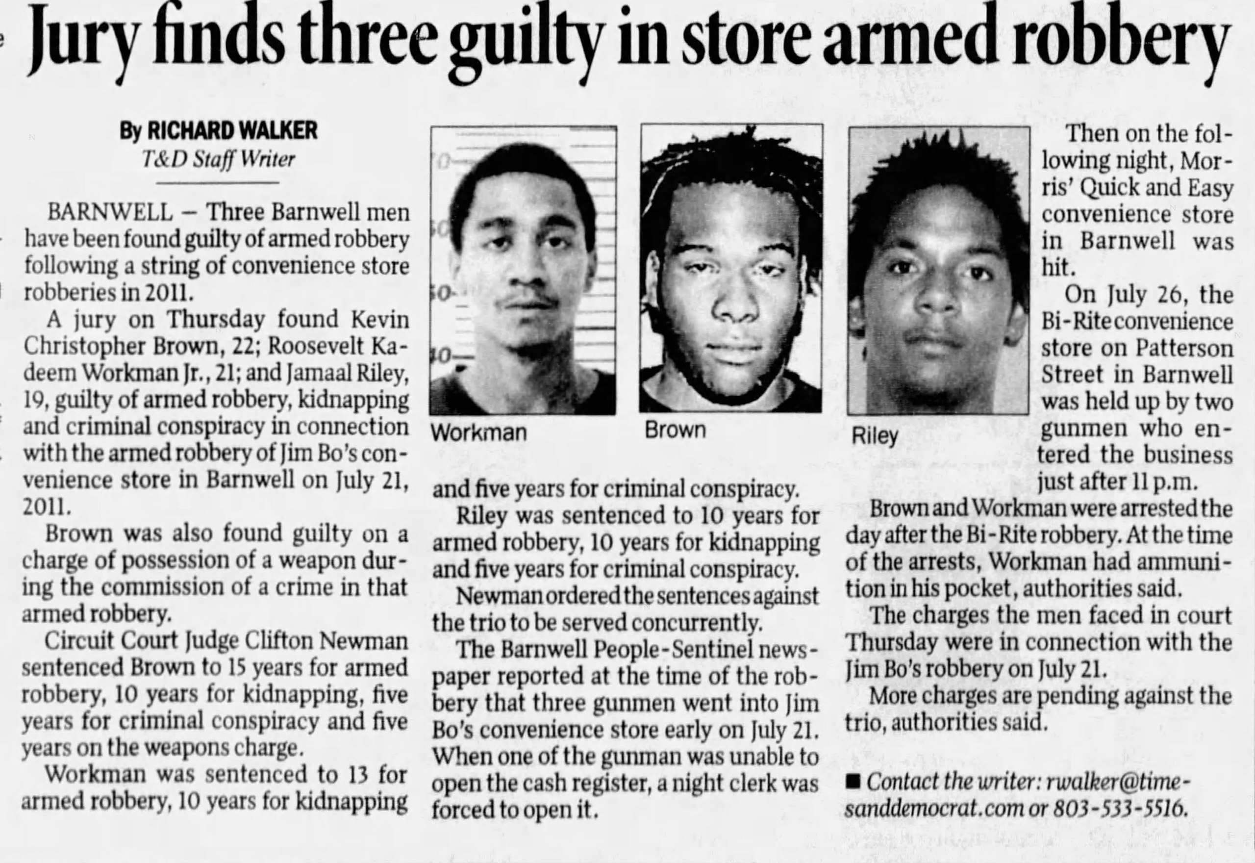 Of interest? On September 6, 2012, circuit court judge Clifton Newman sentenced Riley to 10 years for armed robbery, 10 years for kidnapping and five years for criminal conspiracy in connection with the holdup of Jim Bo’s Convenience Store the previous summer.