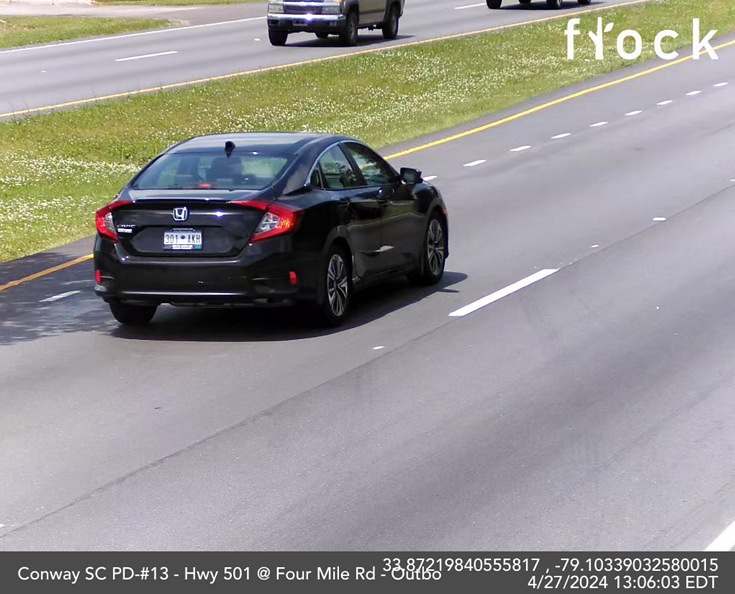 - 1:06 p.m. EST – Miller’s black Honda Accord is observed traveling on Highway 501 near Four Mile Rd., Conway, South Carolina