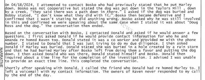 During an initial call with Greer police, Bosko confirmed he “humanely” killed Marley, but failed to go into details. When police contacted him a few days later for more information, he was “not cooperative,” according to a police report. Bosko said Marley was put down in Taylors Mill, S.C. – by a creek. He said he didn’t know if Marley was buried.