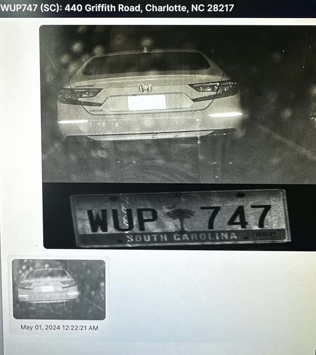 The vehicle Mica Miller paid $232.92 in taxes on just one day before her death was a silver 2019 Honda Accord with the license plate WUP 747. According to a Myrtle Beach police incident report (.pdf) – and the account of her close friends – Miller’s husband took the silver Honda Accord away from her when she was admitted to a mental health facility on February 8, 2024. That car was photographed in Charlotte North Carolina four days after Miller’s death.